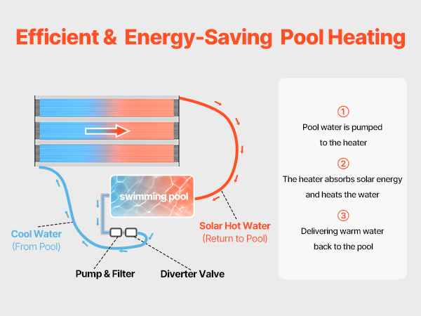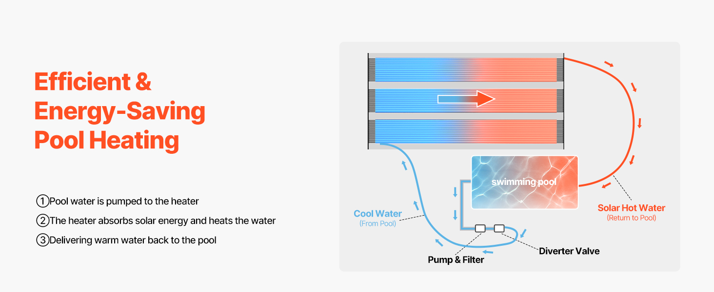 Izmantojot mūsu saules baseina sildītāju baseina apsildei, samazinās enerģijas patēriņš un elektrības izmaksas. Mūsu saules baseina sildītāji maksimāli palielina saules starojumu, lai ātri paaugstinātu ūdens temperatūru, pagarinot peldēšanas sezonu.