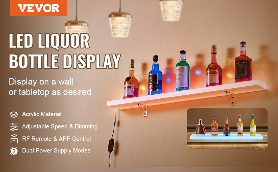 VEVOR LED Lighted Liquor Bottle Display, 1 Tier 40 Inch Wall Mounted Whiskey Rack Stand, 1 Step Commercial Illuminated Home Bar Shelf, Acrylic Drinks lighting Shelves with RF Remote & App Control