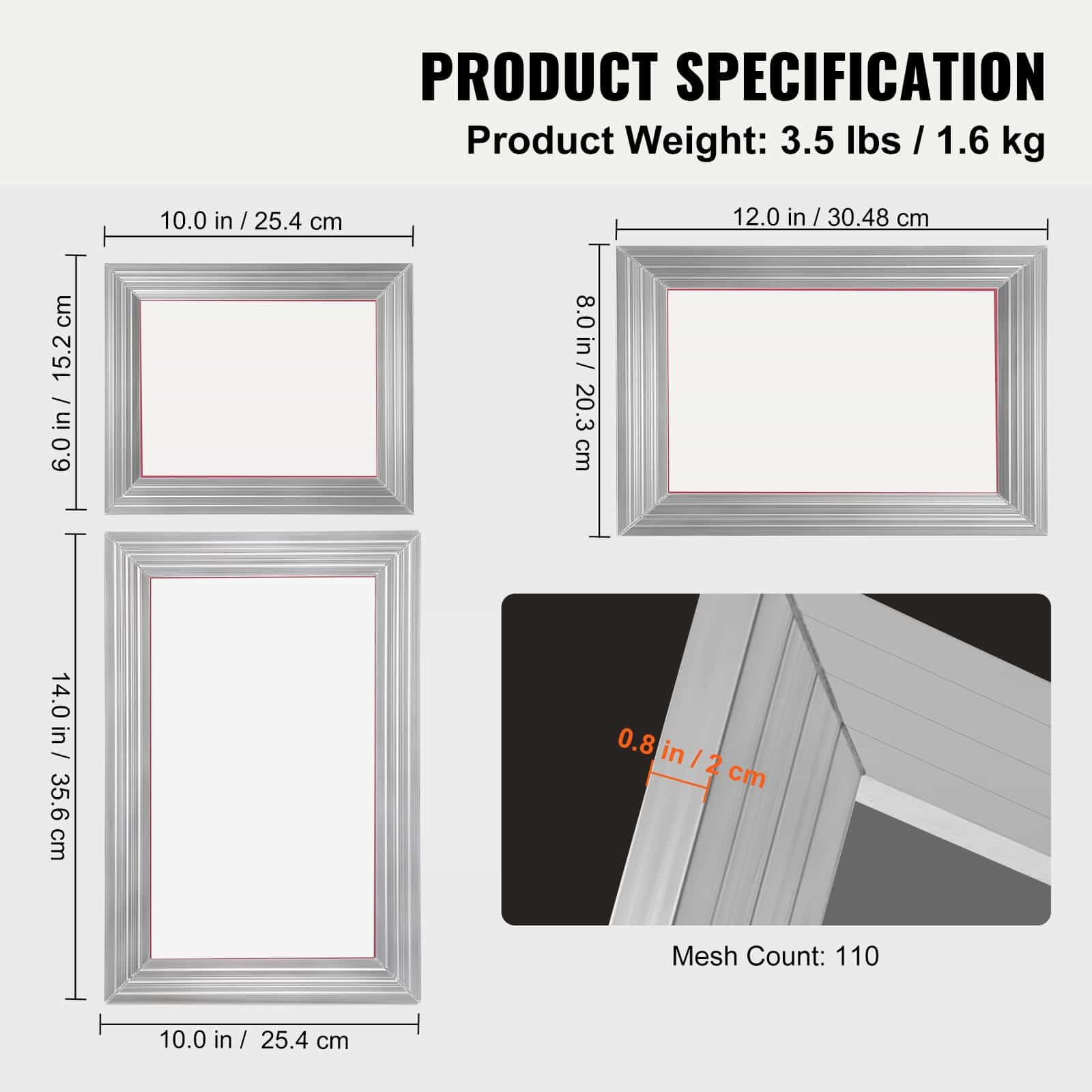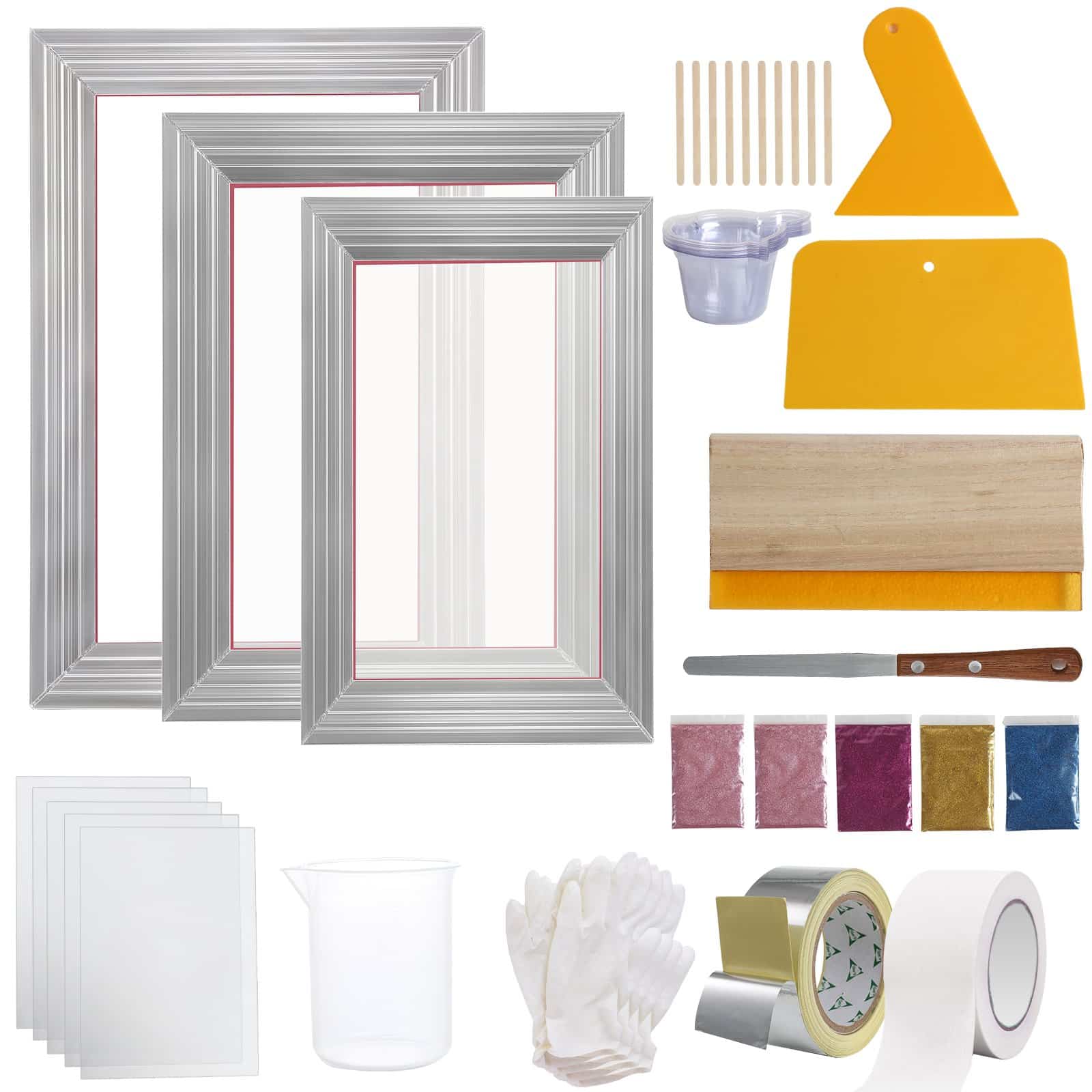 VEVOR Uzlabots Sietspiedes Komplektu ar 3 Alumīnija Rāmjiem (15x25cm/6x10in, 20x30cm/8x12in, 25x35cm/10x14in) 110 Acu, Špakteļlāpstiņu, Spīdumiem un Caurspīdīgām Plēvēm T-kreklu DIY Apdrukai