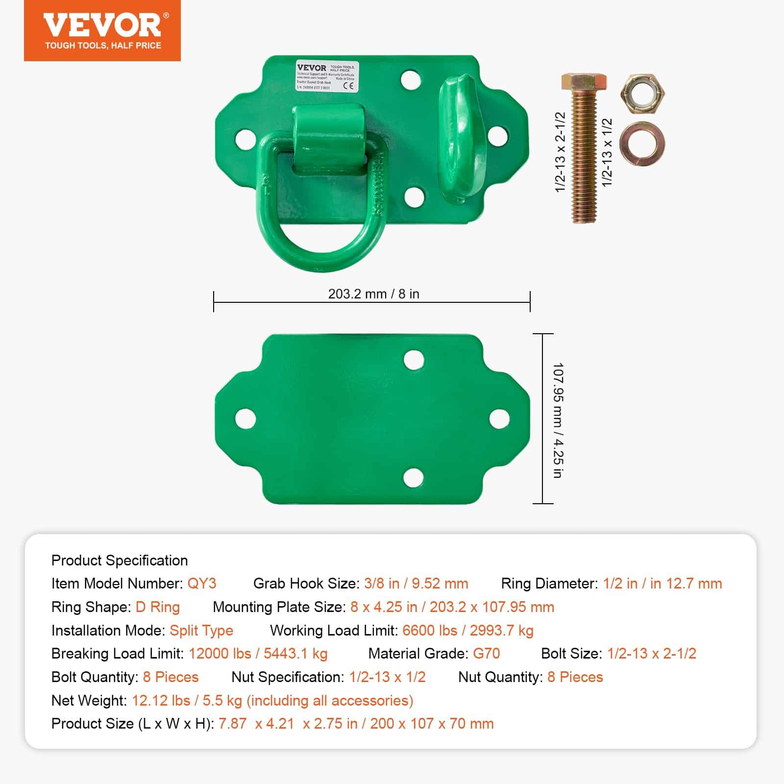 VEVOR 3/8'' skrūvējami traktora kausa āķi ar stiprinājuma gredzeniem, G70 tērauds, max slodze 6800 kg, 2 gab., zaļi