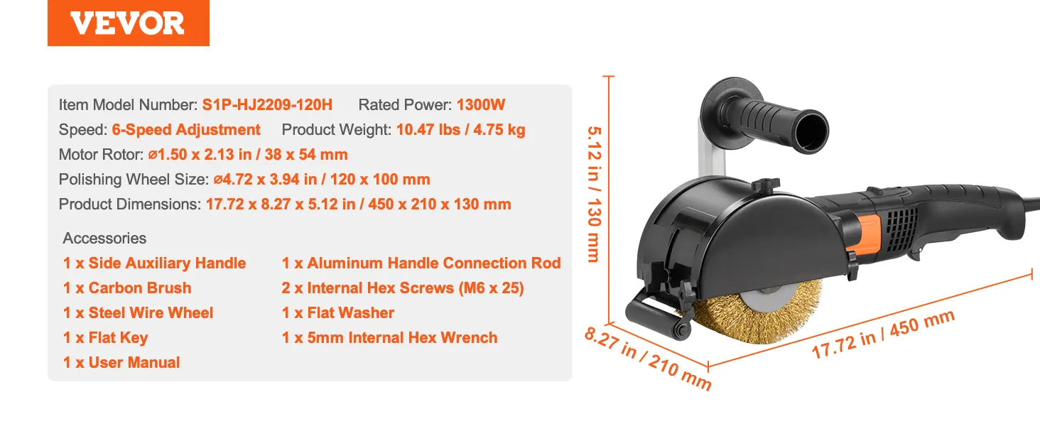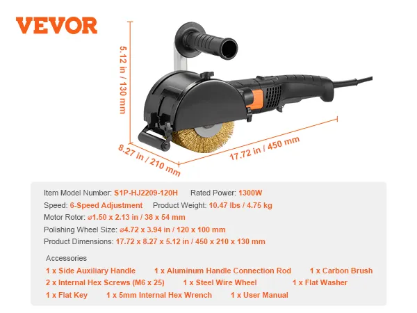VEVOR 1300W Elektriskā Metāla Pulēšanas un Slīpēšanas Mašīna, 6 Ātrumi, Tērauda Birste, 900–3200 apgr./min