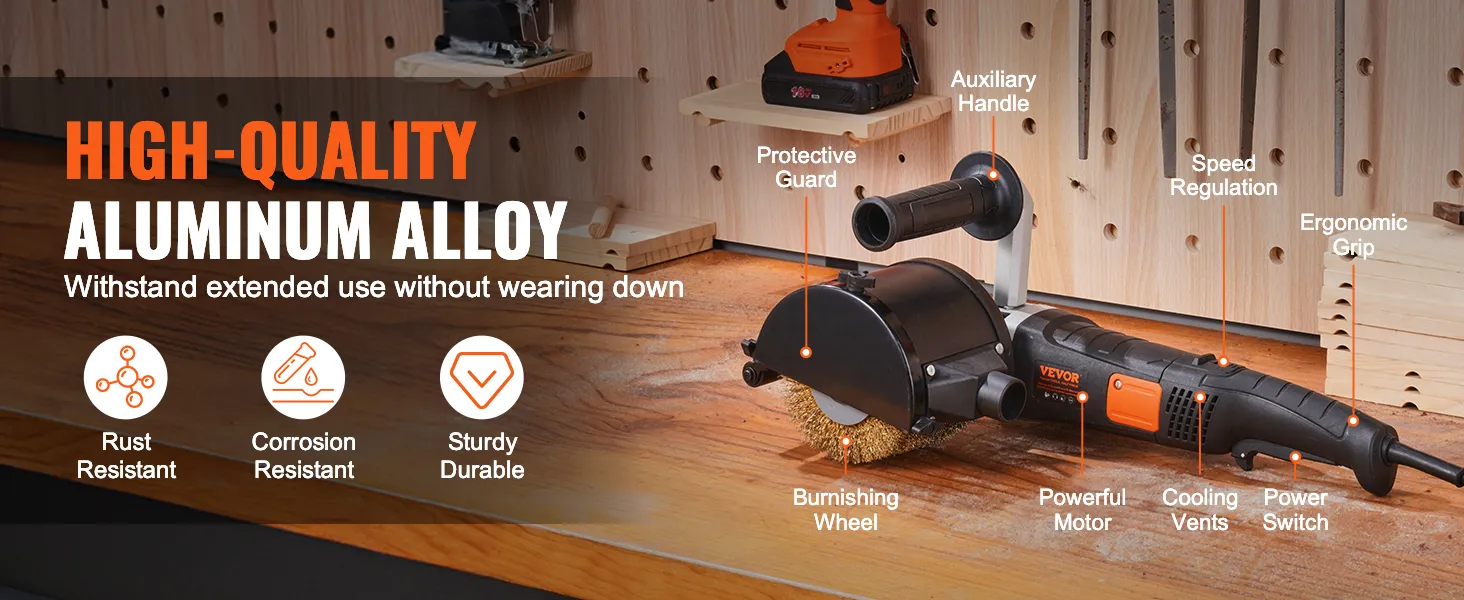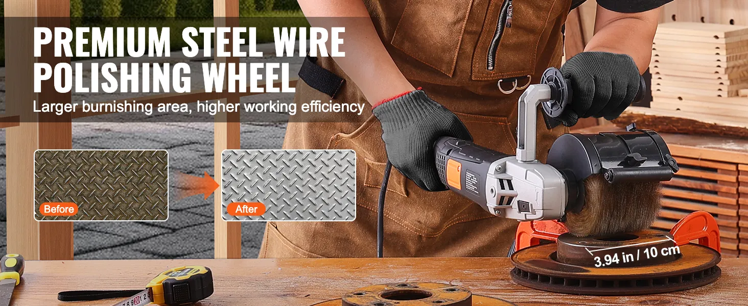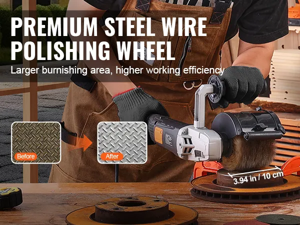 • Augstākās kvalitātes pulēšanas disks: Šī elektriskā pulēšanas mašīna ir aprīkota ar tērauda stiepļu pulēšanas disku, kas efektīvi noņem rūsu, oksīda slāņus un skrāpējumus. Atstāj gludu, pulētu apdari un nodrošina efektīvu virsmas kondicionēšanas apstrādes efektu.