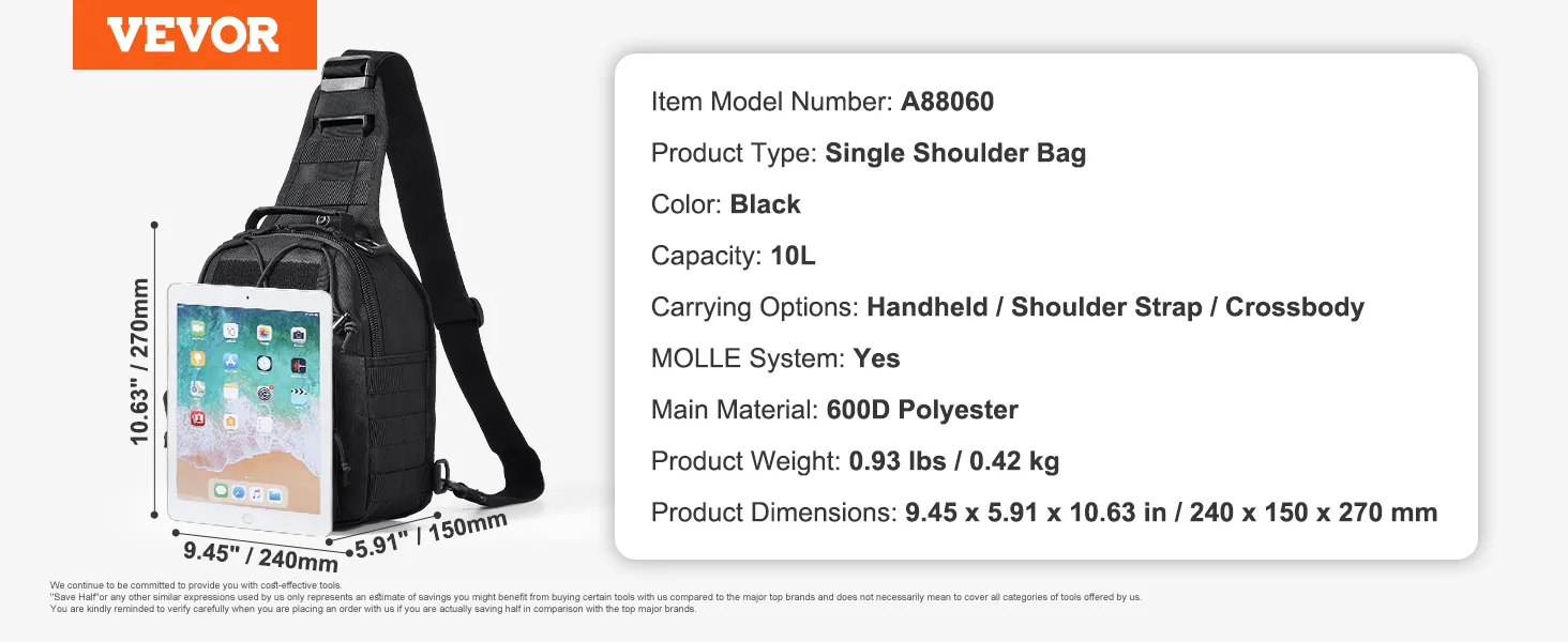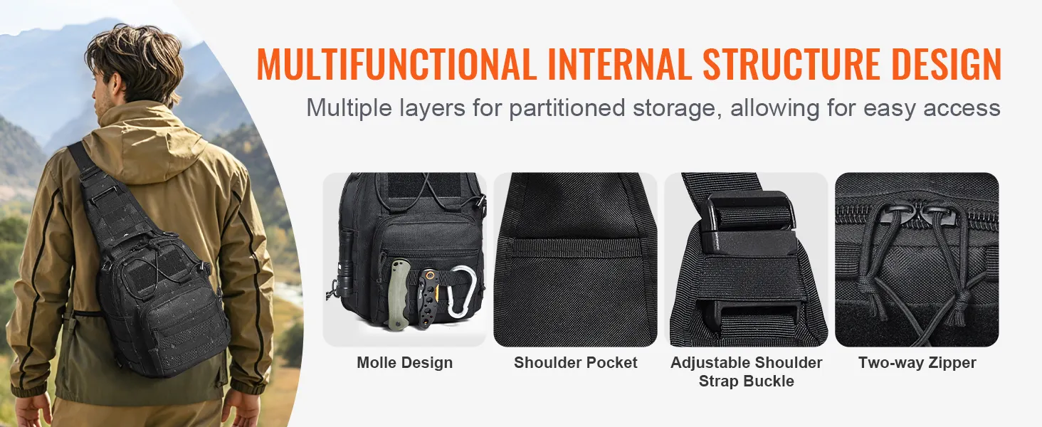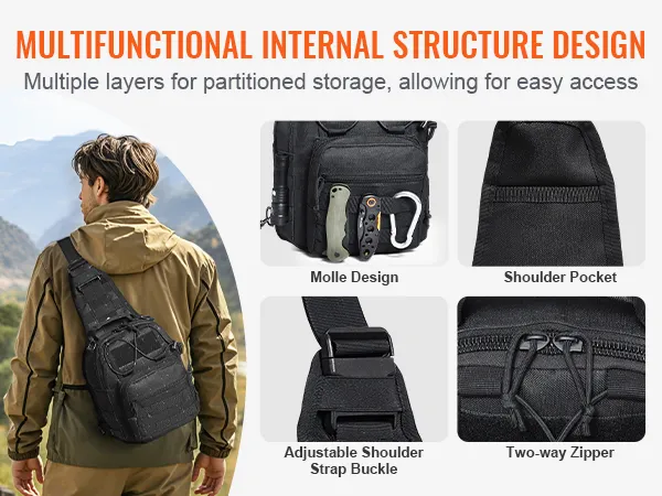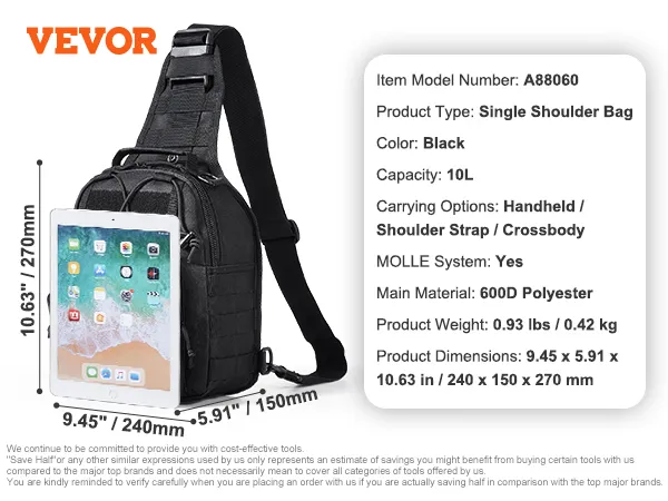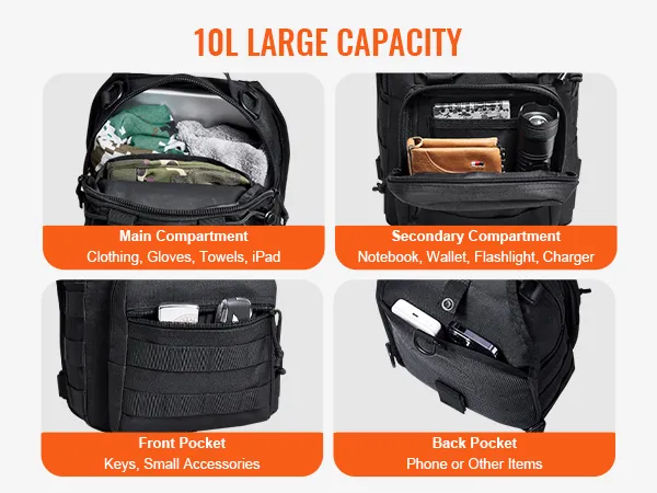 VEVOR Tactical Sling Bag, 10L Military Rover Shoulder Sling Backpack with Molle Design and Multi-pocket,  600D Tactical Shoulder Bag Ideal for Caping, Hiking and Every Day Carry, Black