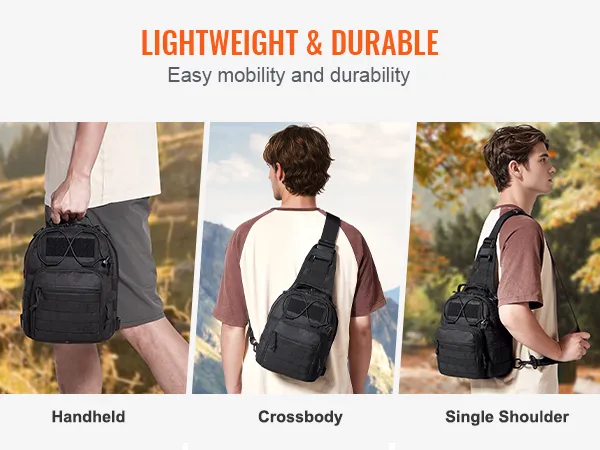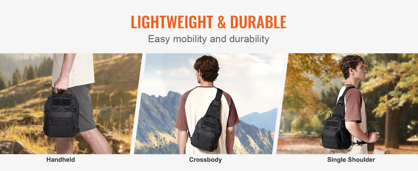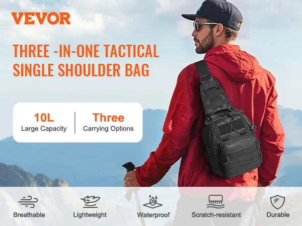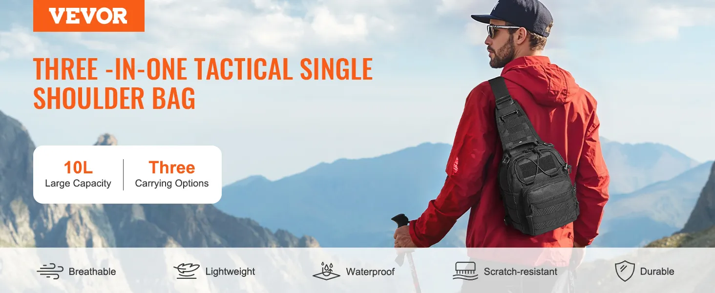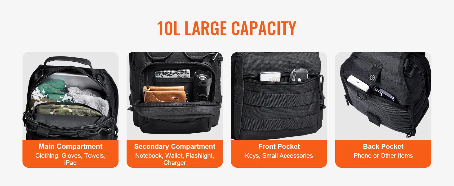 This tactical sling bag can be used as a hand-carry bag, crossbody bag, or shoulder bag, with a capacity of 10L. It can hold clothes, shoes, and other travel essentials. Made from breathable, lightweight, waterproof, and scratch-resistant materials, it's built for durability.