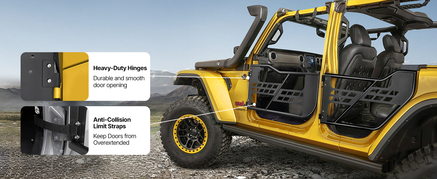 Mūsu Jeep cauruļveida durvis ir ideāls papildinājums piedzīvojumiem brīvā dabā. Tās ir izstrādātas, lai atbilstu rūpnīcas eņģēm un aizbīdņiem, uzlabo redzamību, gaisa plūsmu un padara braukšanu bezceļos atsaucīgāku un patīkamāku.