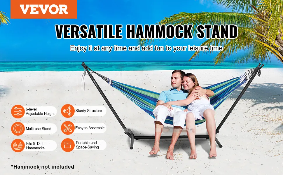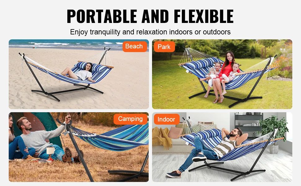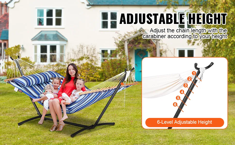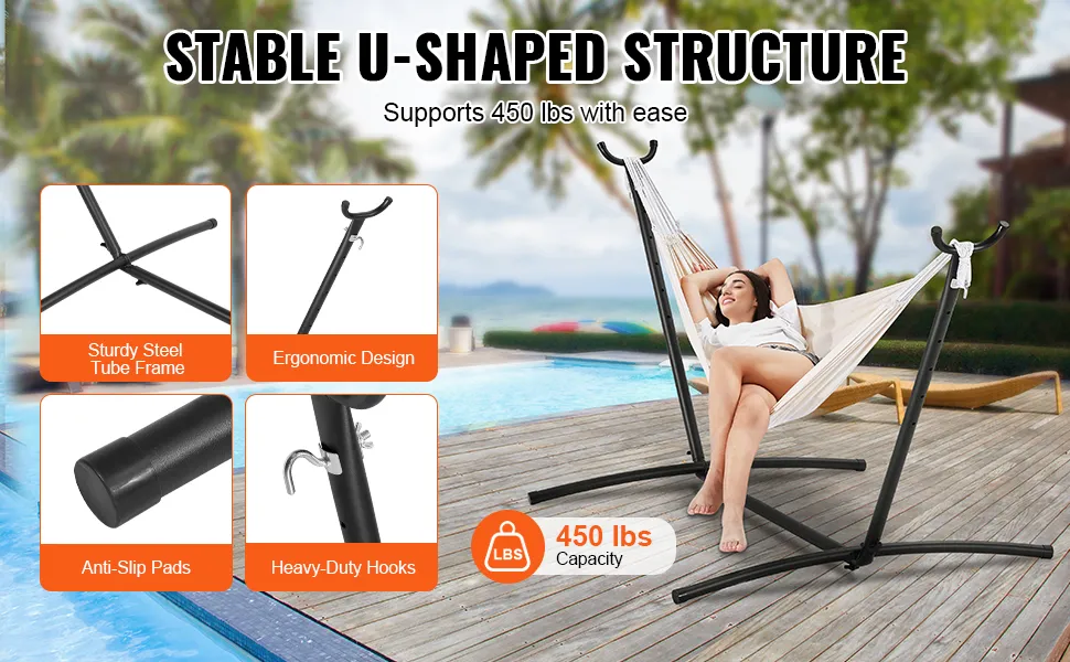 • Vairākas regulēšanas iespējas: Šim šūpuļtīkla rāmim ir S formas āķi, un tas nodrošina 6 dažādus regulēšanas līmeņus, kurus var viegli pielāgot jebkuram vēlamajam augstumam, padarot to piemērotu visu vecumu cilvēkiem. Piezīme: Šūpuļtīkls nav iekļauts komplektā.