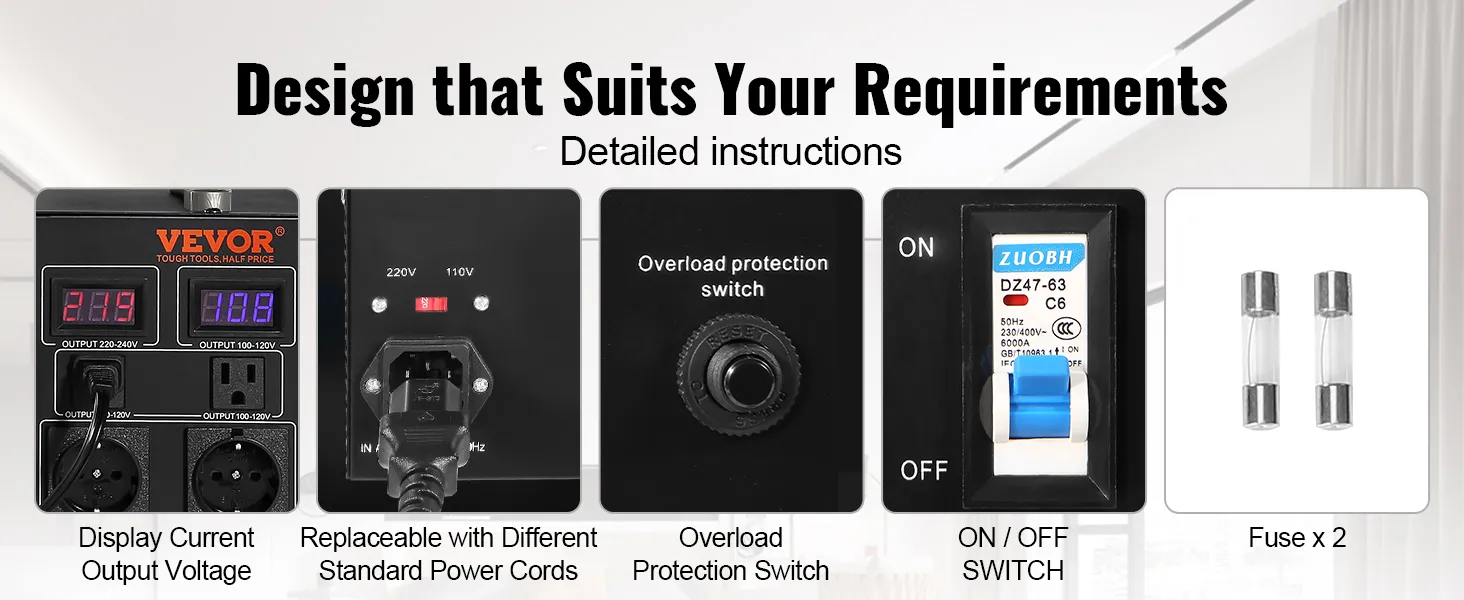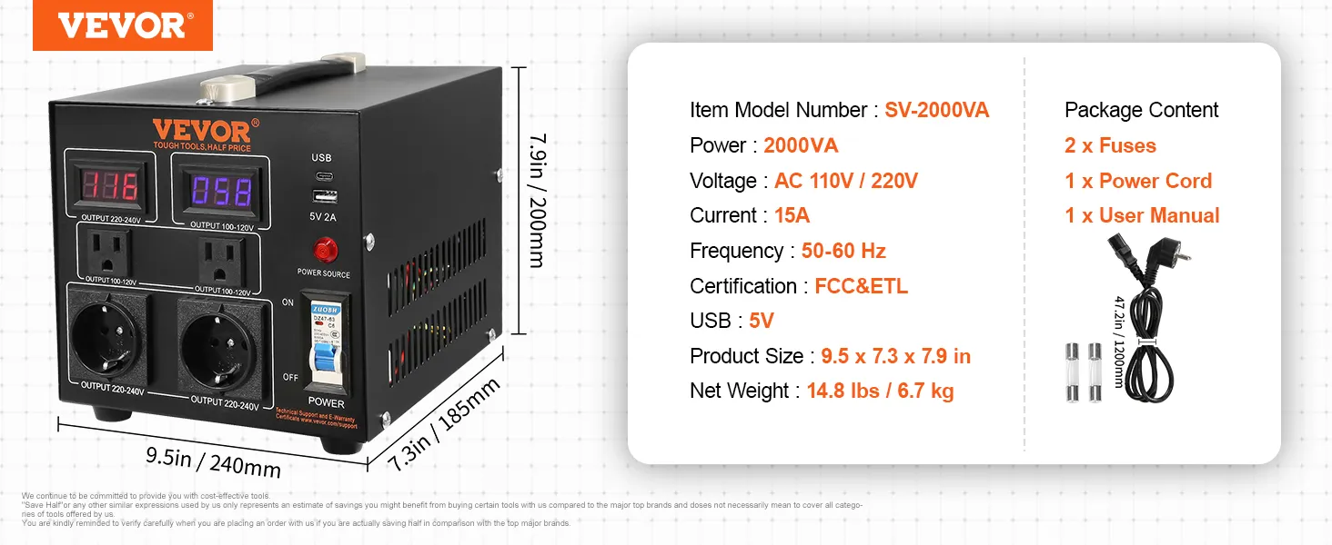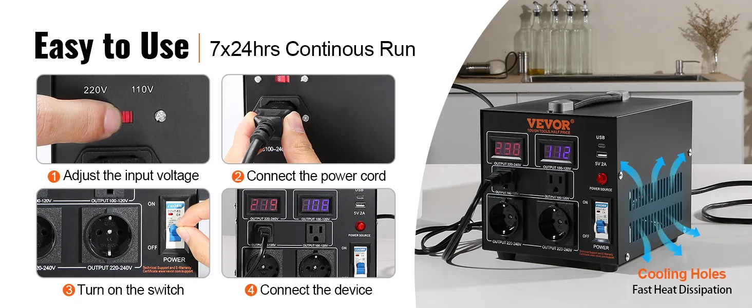 Šis jaunais VEVOR sprieguma pārveidotājs-transformators nodrošina 110V/220V divvirzienu sprieguma pārveidošanu, kas ir piemērojama vairuma valstu sprieguma apmaiņai, lai jūs varētu ņemt līdzi sadzīves tehniku un izmantot tās ārzemēs. Tam ir 6 kontaktligzdas, kas atbalsta līdz 6 ierīcēm, kas savienotas vienlaicīgai lietošanai.