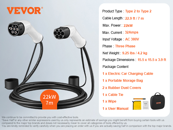 VEVOR EV car charging cable is compatible with all type 2 models, plug and play, and is a dependable travel companion. The storage bag solves all your travel and outdoor emergency charging problems. When you are ready to charge again, you will already know where to go!