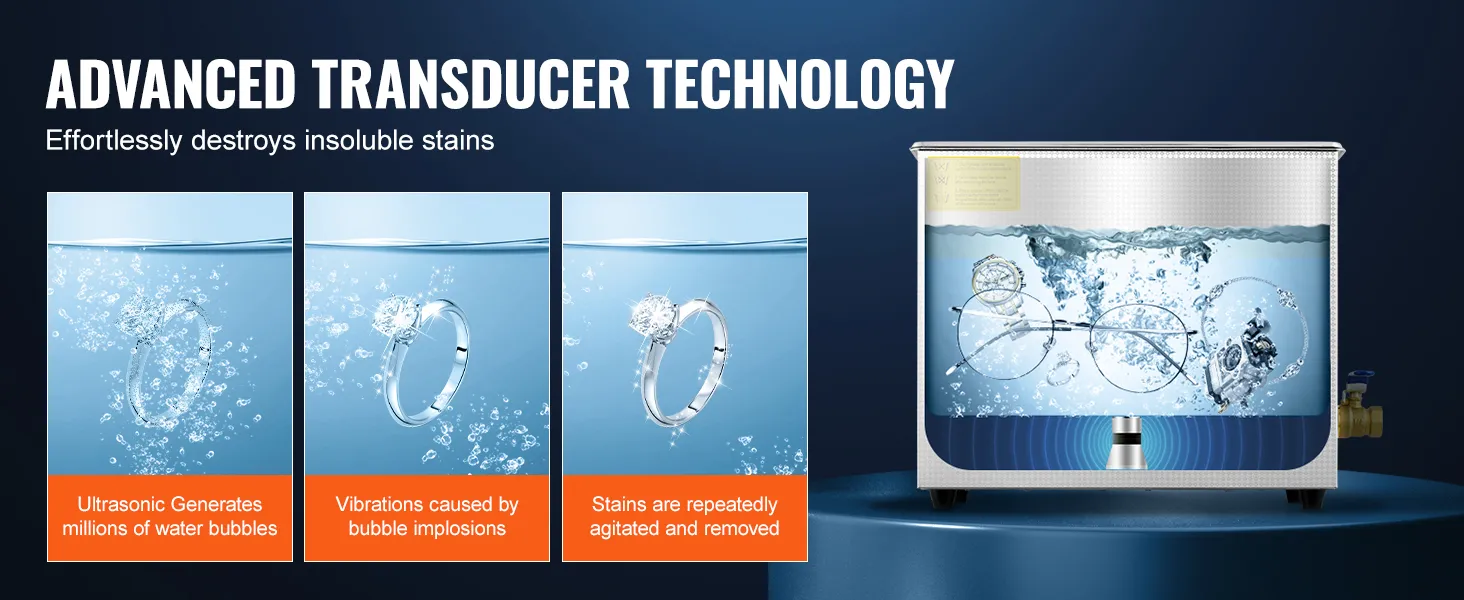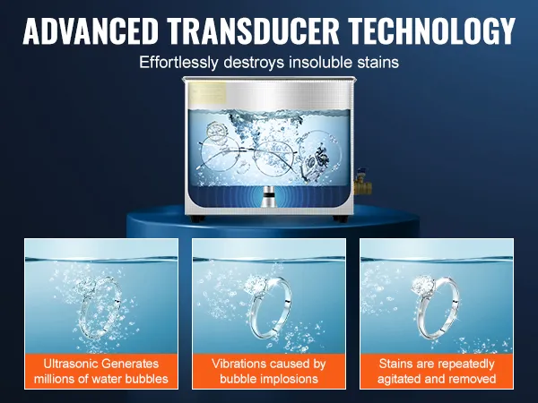 • Uzlabota pārveidotāju tehnoloģija: Mūsu ultraskaņas rotaslietu tīrītājam ir trīs uzlaboti pārveidotāji, kas aprīkoti ar sendviča tipa pjezoelektriskiem pārveidotājiem. Zinātniski izstrādāts, lai uzlabotu tīrīšanas efektivitāti un kvalitāti, tas atsvaidzina jūsu priekšmetus neatkarīgi no tā, vai tie paredzēti ikdienas lietošanai vai profesionālai tīrīšanai.