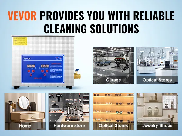 • Daudzpusīgs pielietojums: VEVOR ultraskaņas tīrīšanas iekārtai ir vairāki sertifikāti, kas nodrošina uzticamību un padara to piemērotu plašam pielietojumu klāstam. No laboratorijām un karburatoriem līdz shēmas platēm, zobārstniecības iekārtām, rotaslietām, brillēm, pulksteņiem un galda piederumiem. Uzticieties mūsu produktam, lai nodrošinātu profesionālas kvalitātes tīrīšanu.