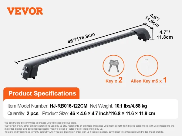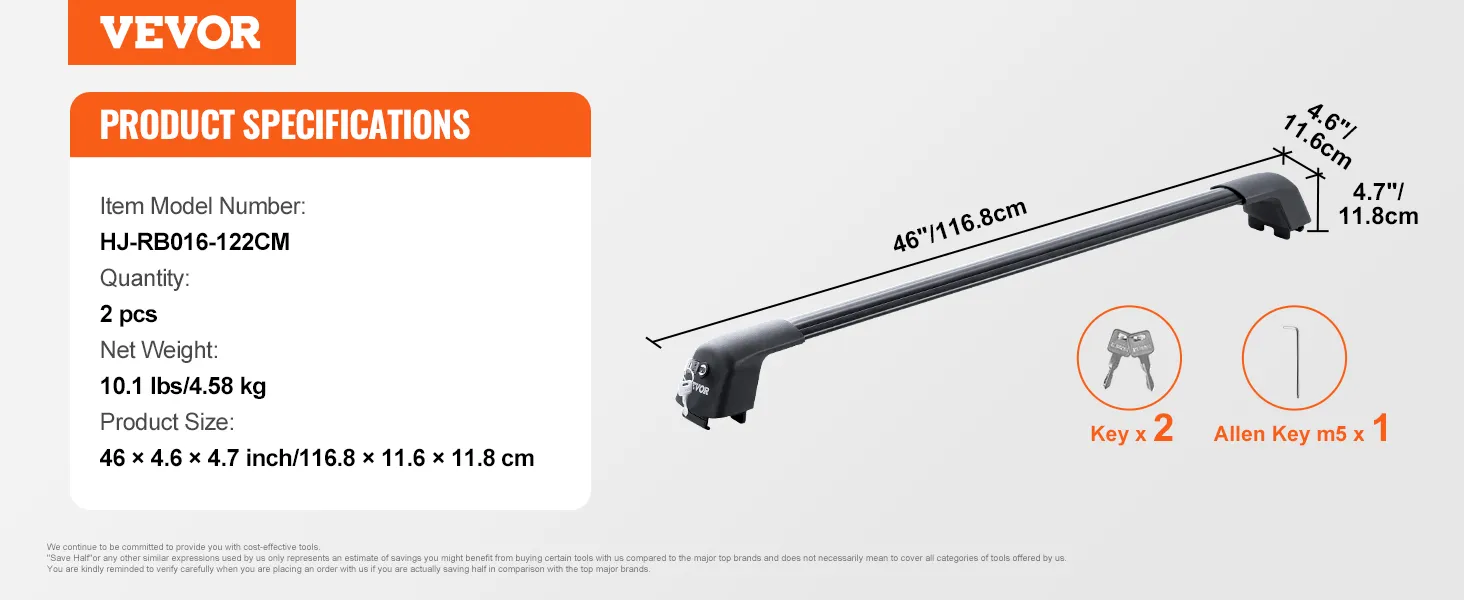 VEVOR Universālais Jumta Bagāžnieka Pārsegs 116.8-122.8 cm (46-48.4 collas) Grozāmām Sānsliedēm, 100KG Svara Izturība, Pretzagšanas, Bez Trokšņa