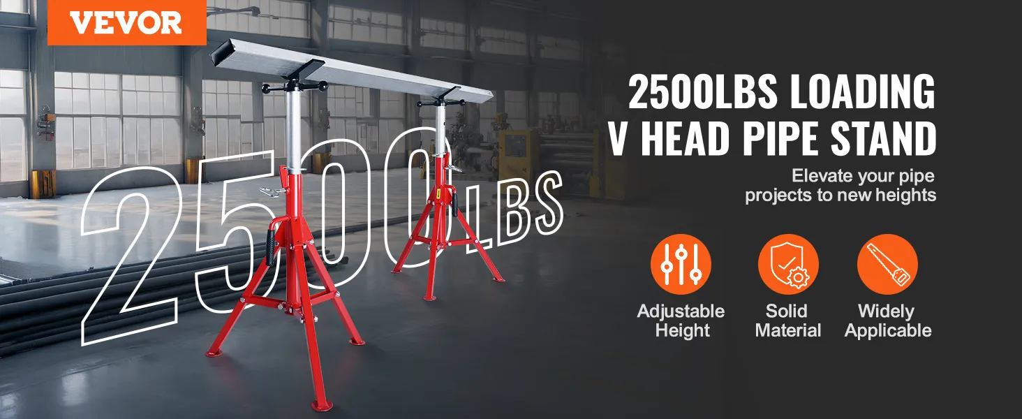 Cauruļu statīvs ar V veida galvu ir paredzēts ātrai un vienkāršai lietošanai, un tam ir fiksācijas gredzeni, kas ļauj ātri vertikāli regulēt augstumu no 28 collām līdz 52 collām. Maksimālais celtspēja var sasniegt 2500 mārciņas/1134 kg. Tā rezultātā tas ir labi piemērots cauruļu atbalstam vītņošanas, caurumu griešanas, rievošanas u. c. laikā.