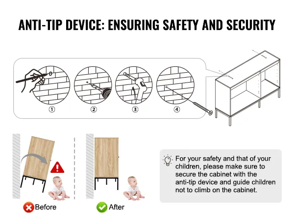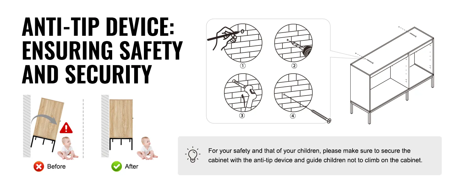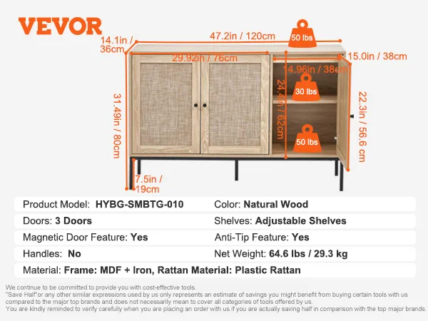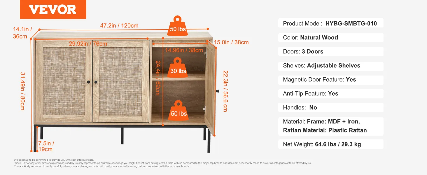 Mūsu bufetes tipa skapis ir izstrādāts ar lielisku svara izturību — augšējais plaukts var izturēt līdz 22,7 kg, iekšējie plaukti — 13,6 kg, bet apakšējais plaukts — 22,7 kg.