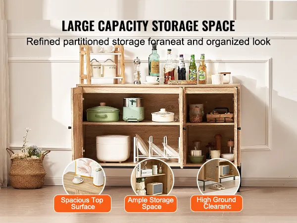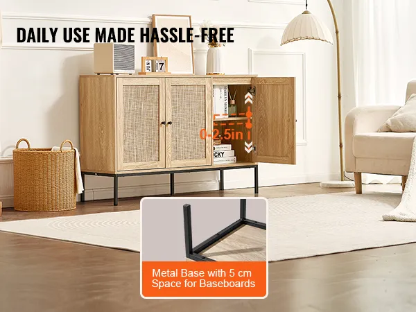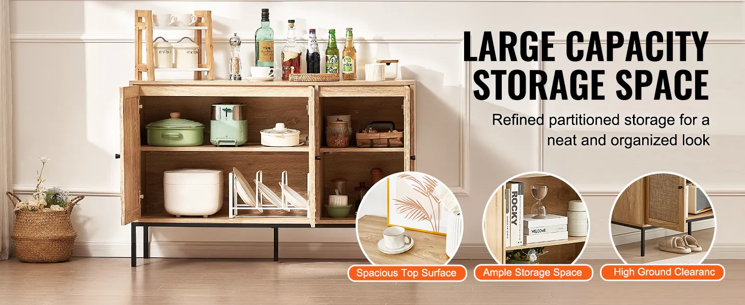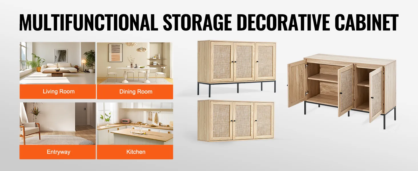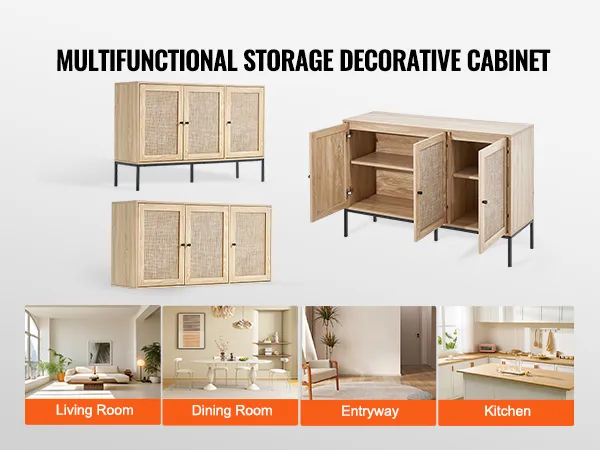 This rattan buffet cabinet offers the perfect storage solution, suitable for use as a kitchen sideboard, bar cabinet, storage unit, or entryway shoe cabinet. Its versatile design makes it adaptable to various settings, serving as both a storage unit and a decorative piece.