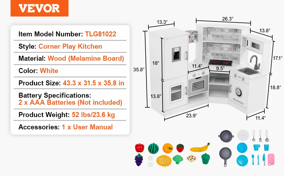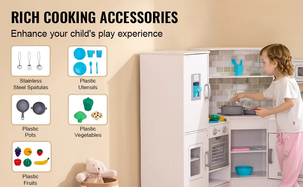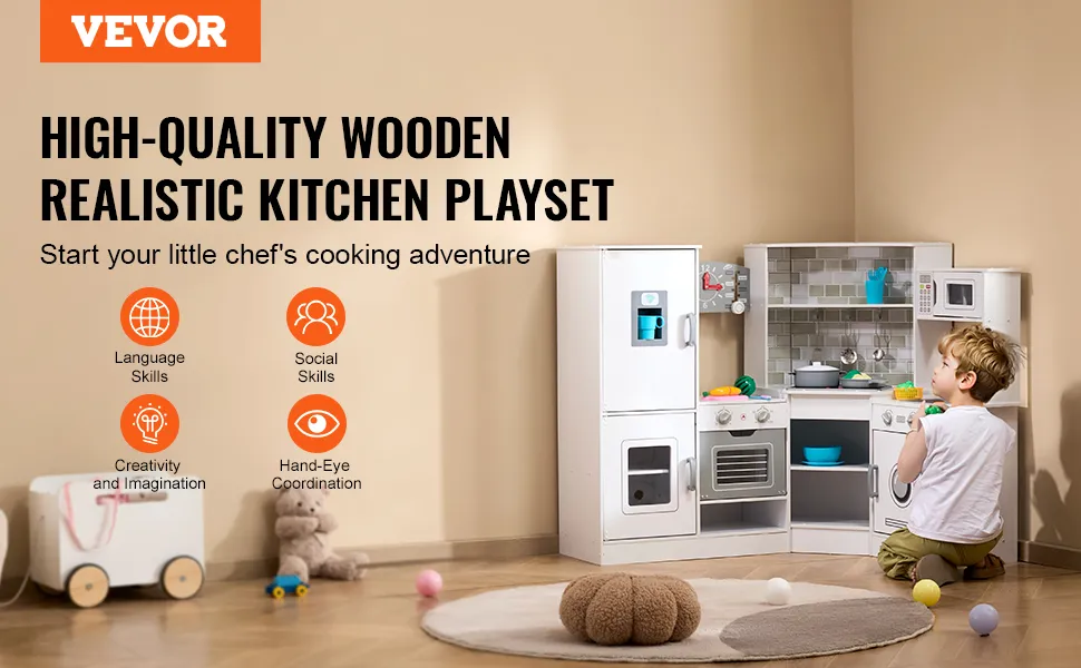 VEVOR Bērnu Koka Virtuves Rotaļu Komplekts ar 24 Aksesuāriem, Stūra Dizains, Gaismas un Skaņas, Balts, 110x80x91 cm