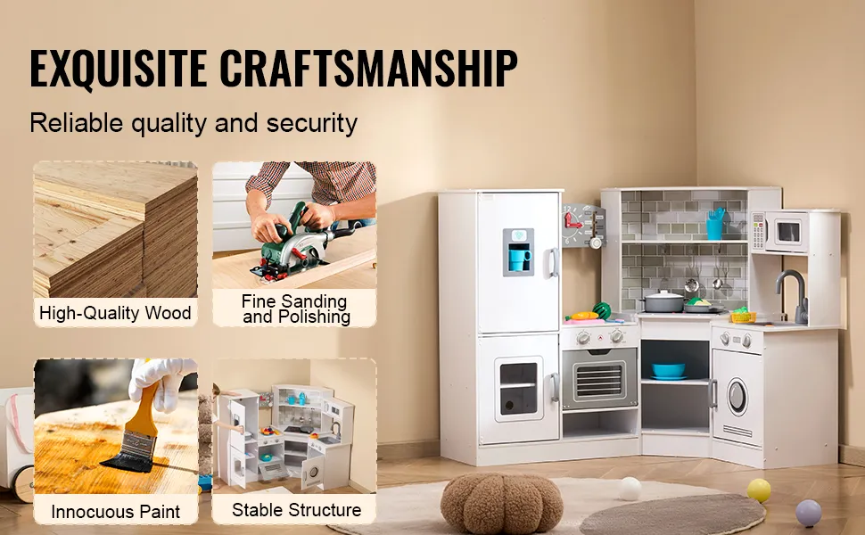 • Reālistisks virtuves komplekts: Ienirstiet jautrības pasaulē ar mūsu stūra rotaļu virtuvi! Šī stūra rotaļu virtuve, kas izstrādāta, lai atdarinātu reālās dzīves aktivitātes, ir aprīkota ar plīti ar reālistiskām gaismām un skaņām, izlietni, veļas mašīnu, cepeškrāsni, ledus automātu un mikroviļņu krāsni. Tā ir ideāli piemērota radošuma rosināšanai, smalko motoriku uzlabošanai un komandas darba veicināšanai, kamēr bērni gatavo gardas maltītes.