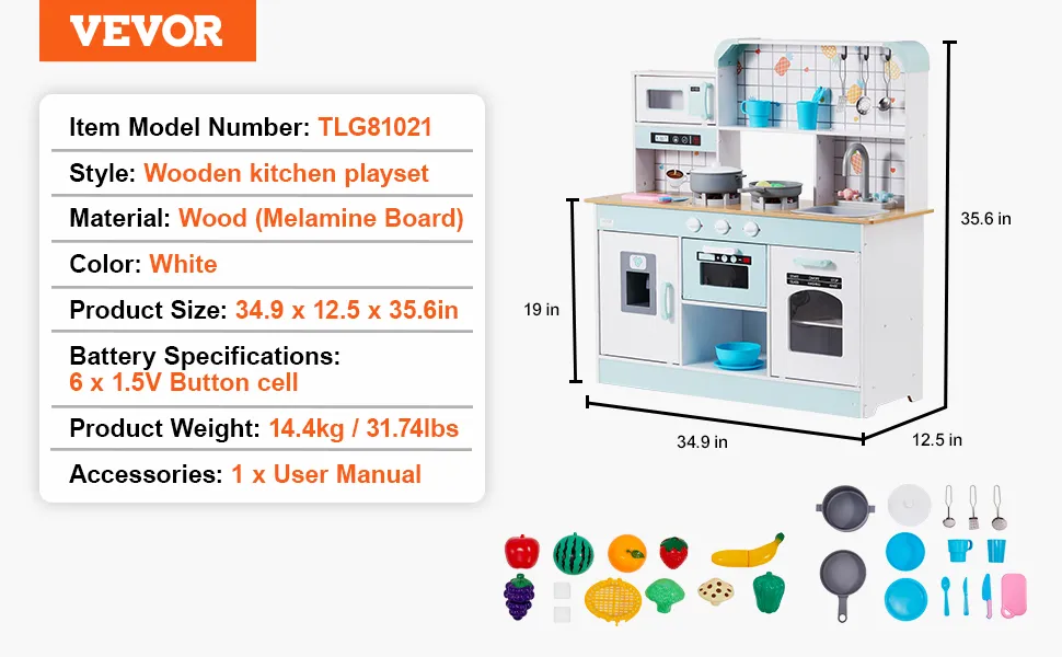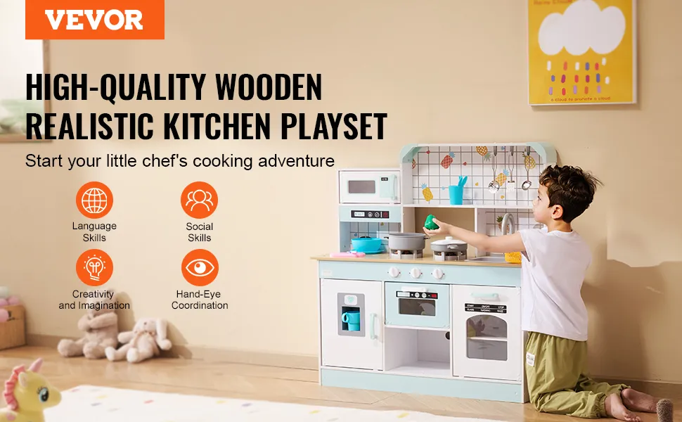 Packed with a variety of accessories, this play kitchen enhances coordination and sparks imagination in children over 3 years old. It's designed to make learning about utensils, colors, and foods fun while improving hand-eye coordination and cooking skills.