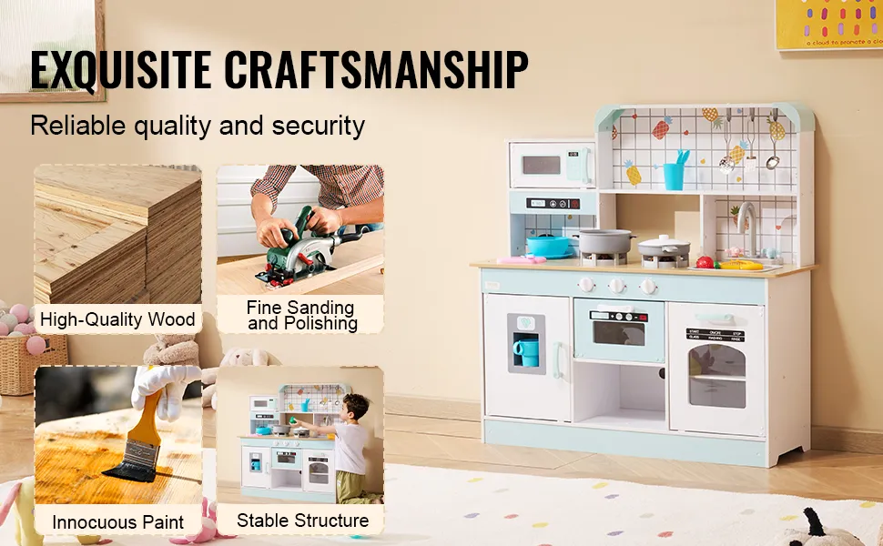 Our kitchen playset provides a blend of fun and functionality with its innovative design, sturdy build, and health-friendly materials. It features realistic kitchen functions that help develop your child's social skills, creativity, and hand-eye coordination.