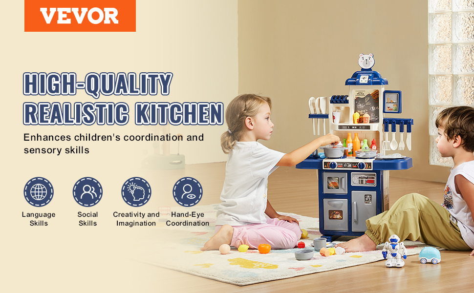 VEVOR Kids Kitchen Playset, Toddler Kitchen with Cooking Stove with Steam, Sounds and Lights, Play Kitchen Set with 48 PCS Cooking Accessory Set for Toddlers, Preschoolers, Children Ages 3-5, Blue