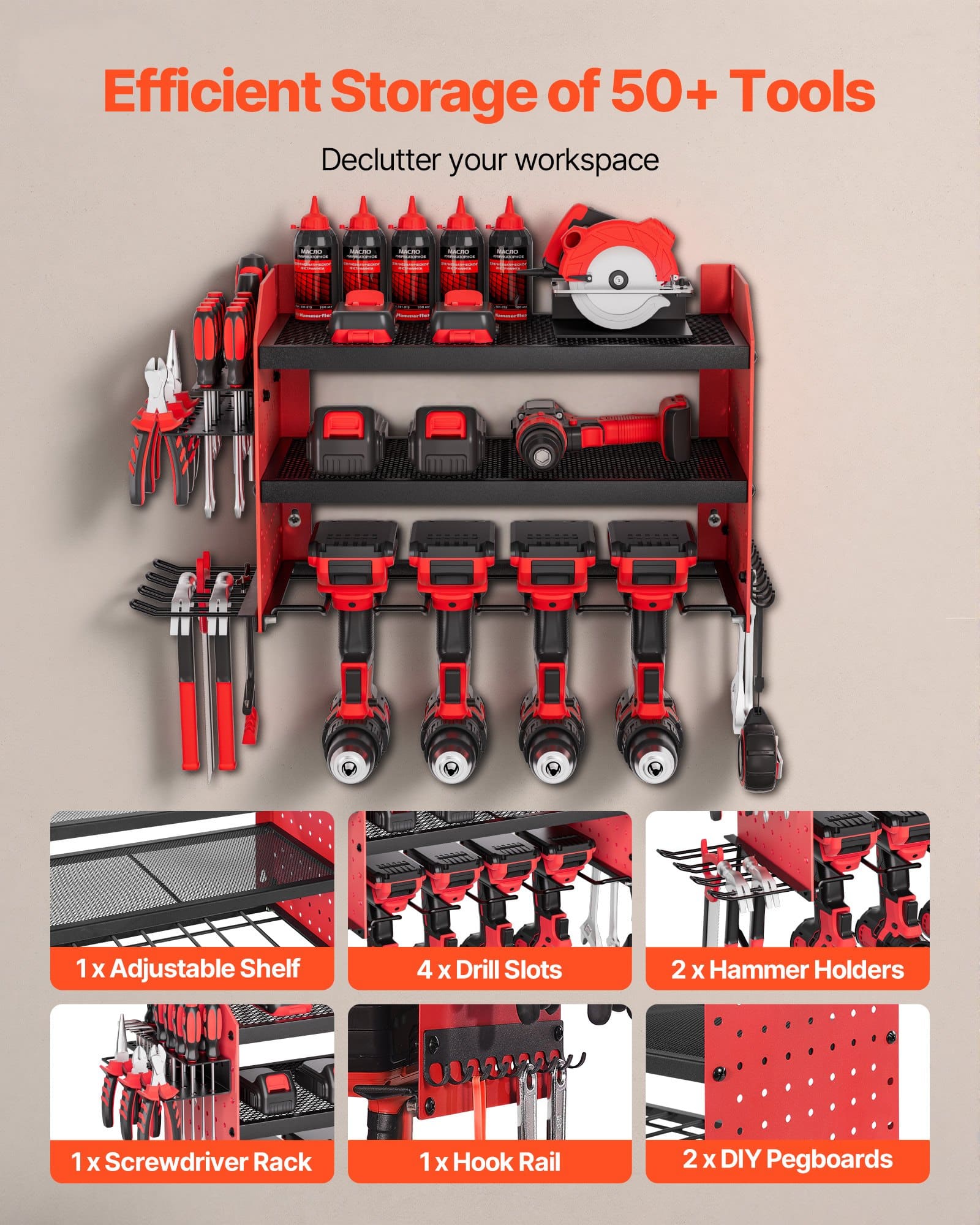 Sienas instrumentu organizatora daudzpakāpju izkārtojums atvieglo vajadzīgā instrumenta satveršanu — augšējais plaukts akumulatoriem un lādētājiem, vidējais instrumentu kastēm un detaļām, apakšējās spraugas urbjiem vai āmuriem. Sānu āķi glīti satur knaibles, skrūvgriežus, uzgriežņu atslēgas un mērlentes.