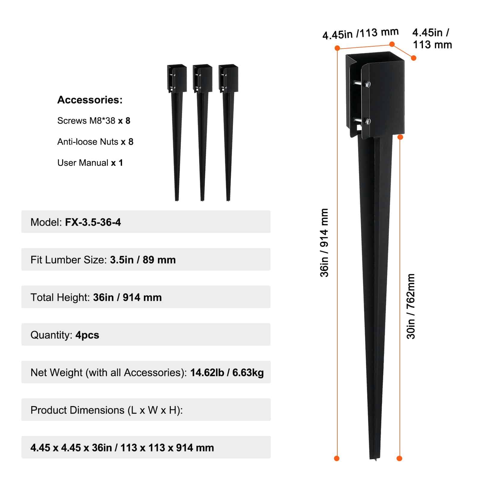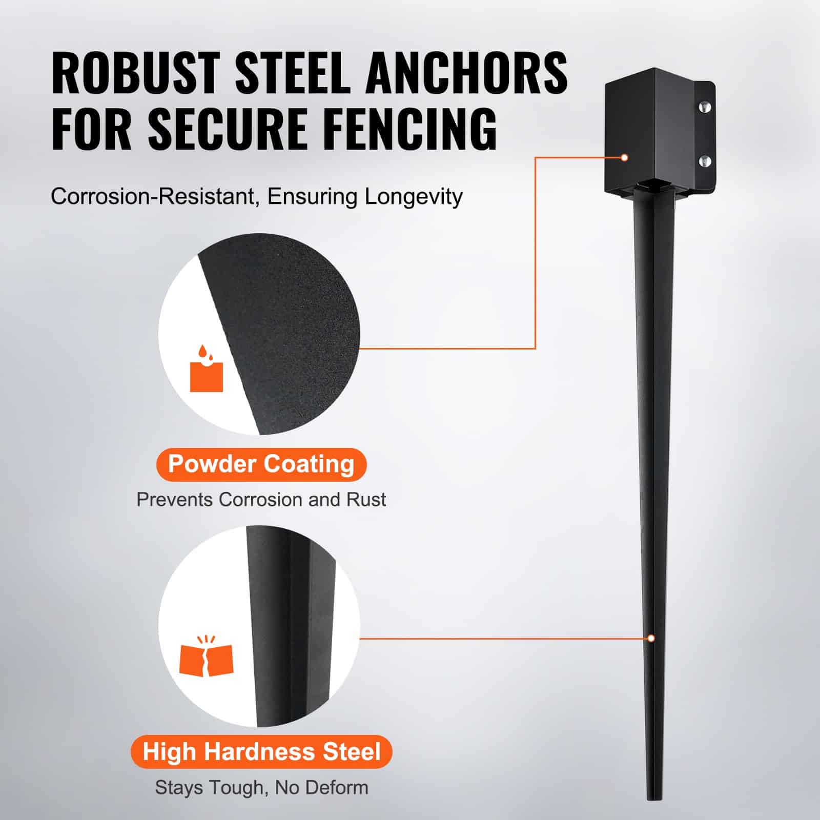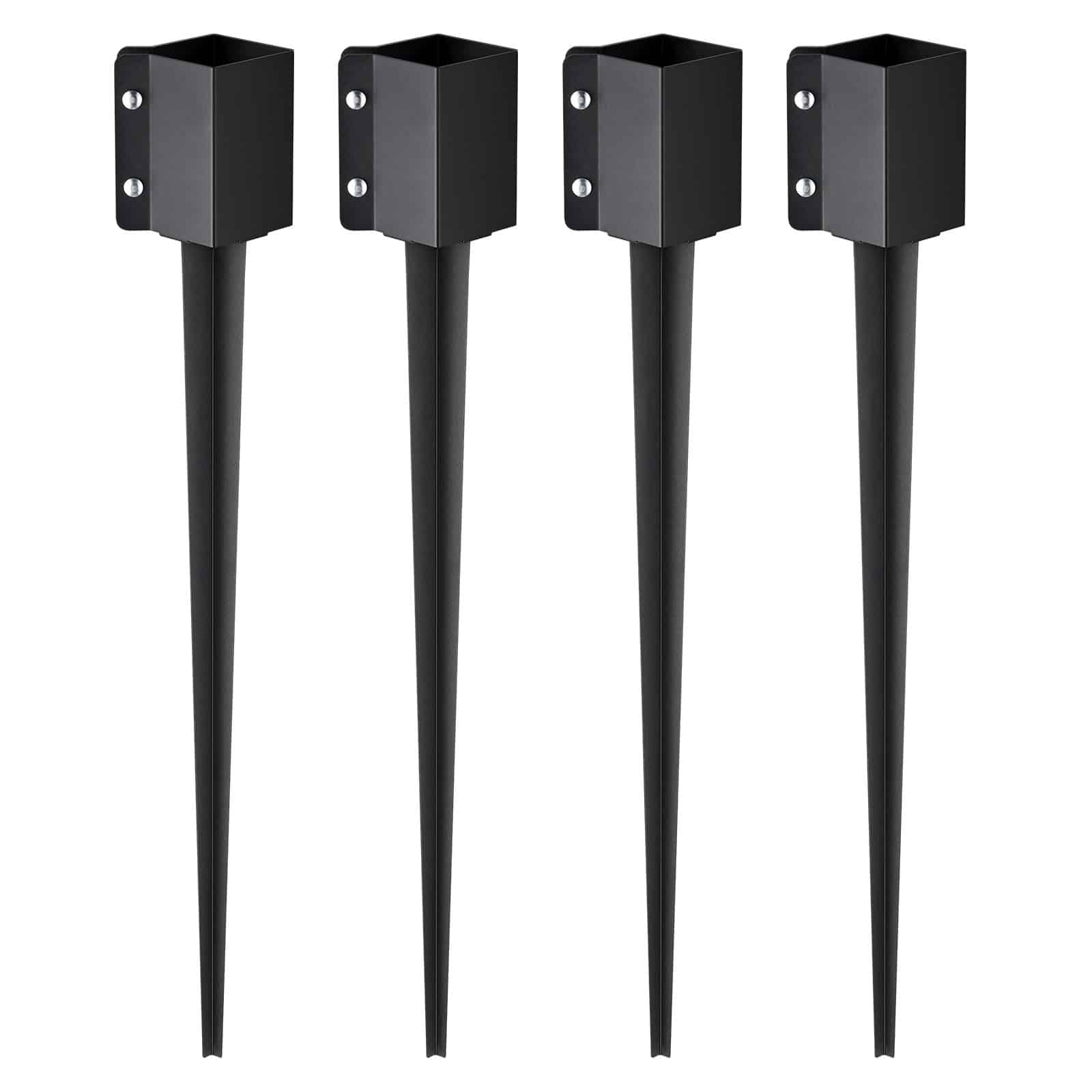 VEVOR Metāla Žoga Staba Enkurs Zemes Stiprinājums 4-gab., 91.4 x 10.2 x 10.2 cm (36 x 4 x 4 in) Ārējais Diametrs, 8.9 x 8.9 cm (3.5 x 3.5 in) Iekšējais Diametrs, Melns Pulverveida Pārklājums Pastkastei, Terasēm, Dārza Margām