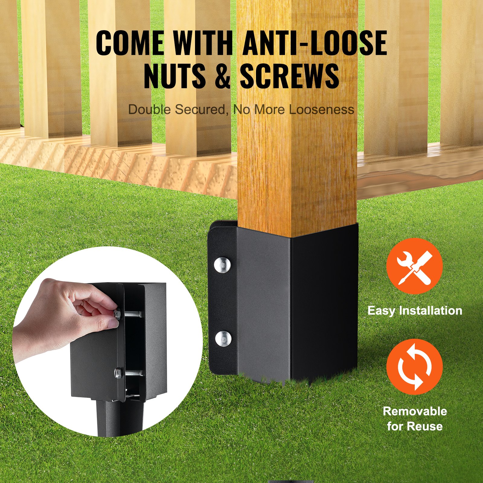 Uzstādīšana ir vienkārša — nav nepieciešams rakt vai izmantot cementu. Novietojiet mietiņu, pievienojiet koka bloku un ar āmuru atskrūvējiet. Pēc dažiem sitieniem pārbaudiet līmeni, iedzeniet to pilnībā zemē un nomainiet ar žoga stabu.
