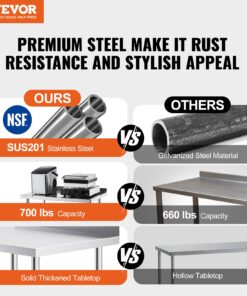VEVOR 61x122x86cm nerūsējošā tērauda darba galds ar regulējamu plauktu virtuvei un ēdināšanai
