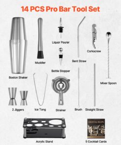 VEVOR 14-Piece Stainless Steel Cocktail Shaker Set with Acrylic Stand – Bartender Kit with Bar Tools & Accessories, Silver