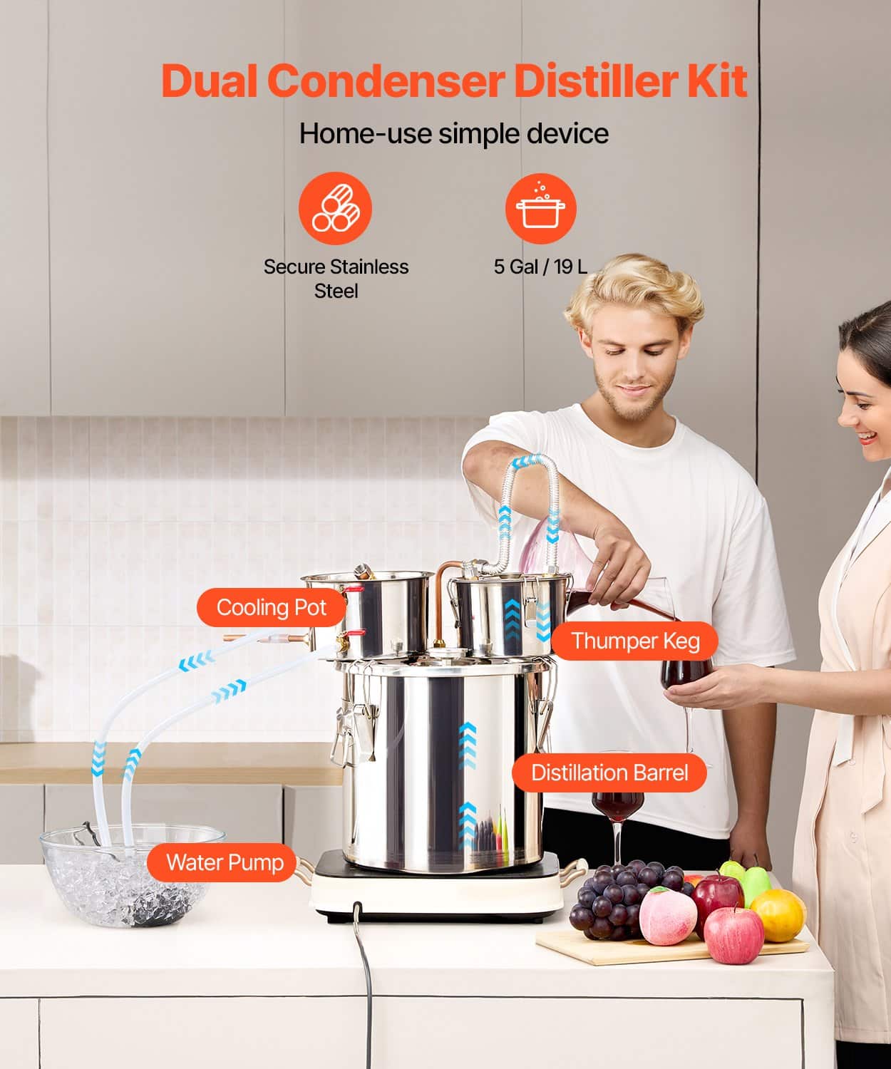 VEVOR 19L Stainless Steel Alcohol Distiller Kit with Copper Coil & Dual Condenser for Whisky, Brandy, Vodka & Wine