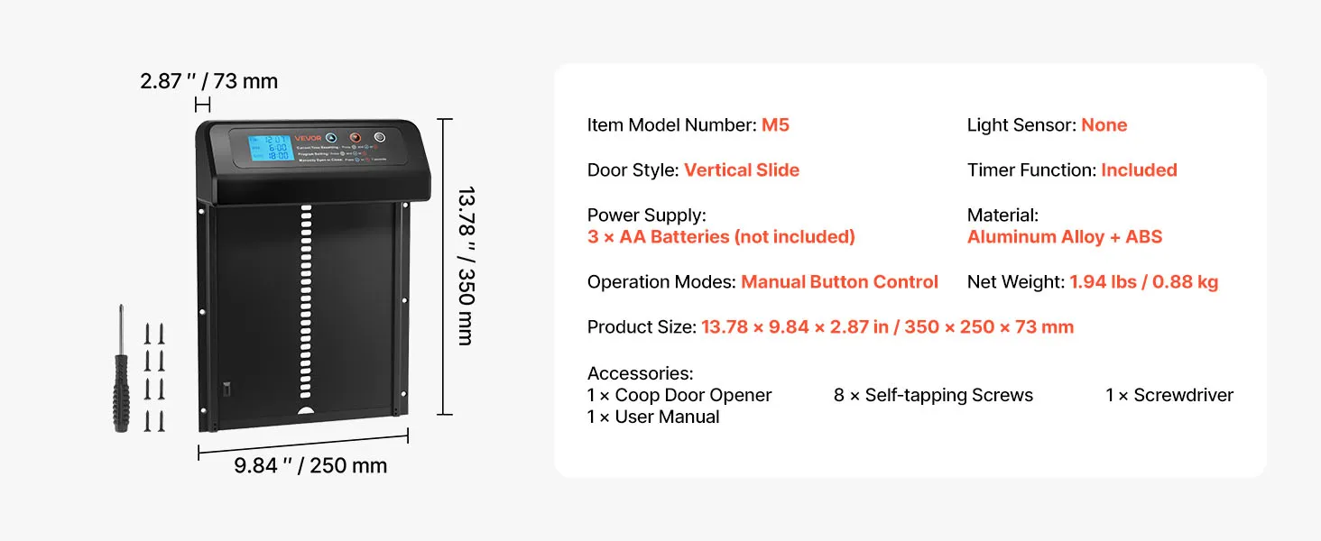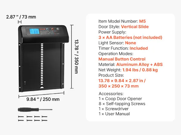 VEVOR Automatic Chicken Coop Door, Battery Powered Chicken Coop Door with Timer & Manual Setting, Anti-Pinch Security, Durable Aluminum Alloy, Auto Chick Run Gate Opener with Waterproof Sealing, Black