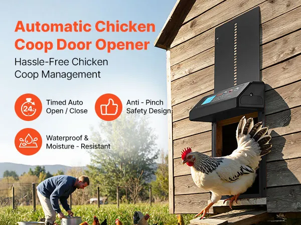 The automatic chicken coop door features two smart modes—timer and manual—for flexible control. Anti-pinch design ensures chickens enter and exit safely. Waterproof and moisture-resistant, it works reliably in all weather conditions.