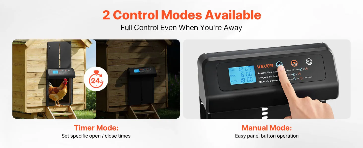 Our battery-powered chicken coop door features timer mode that allows you to set specific open/close times, while manual mode gives you full control at the press of a button.