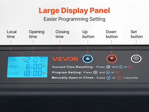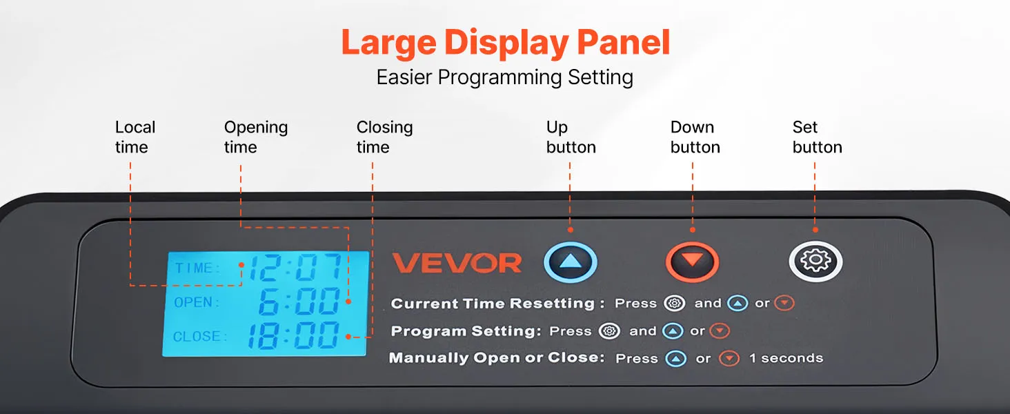 This chicken door comes with large display that clearly shows time, door status, and scheduled settings. Adjusting timers, changing modes, or checking status is simple and intuitive.