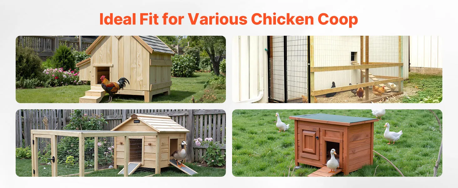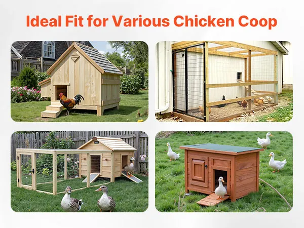 The electric chicken run door fits A-frame, walkway, and free-range coops. Flexible design adapts to different sizes and layouts, from backyard setups to small farms.