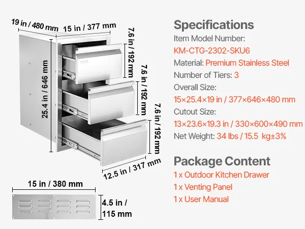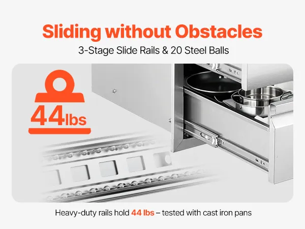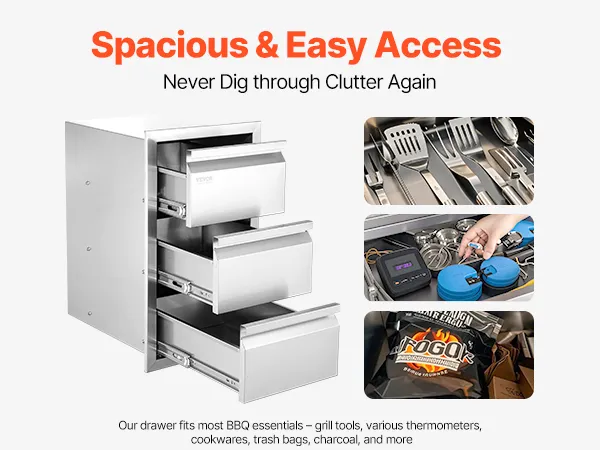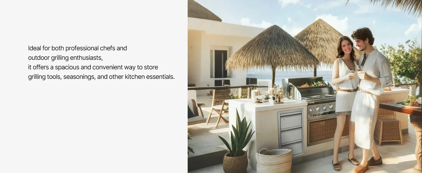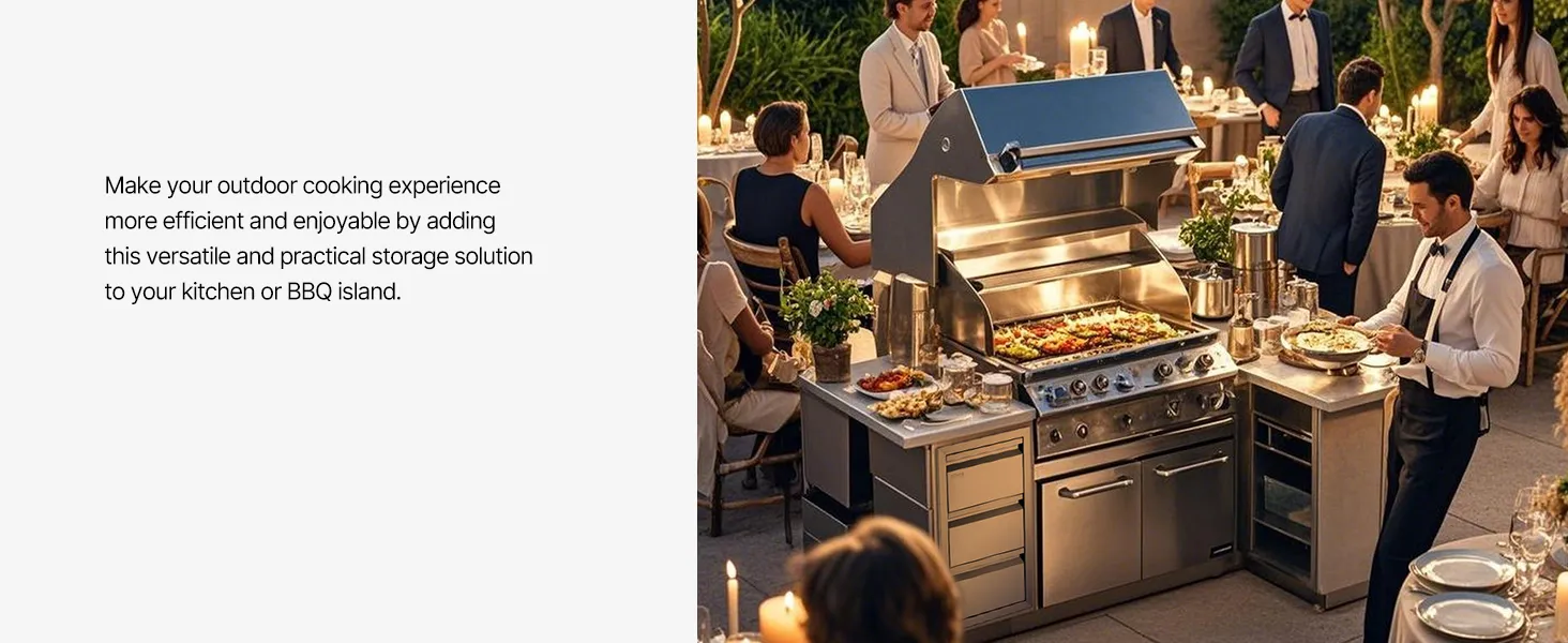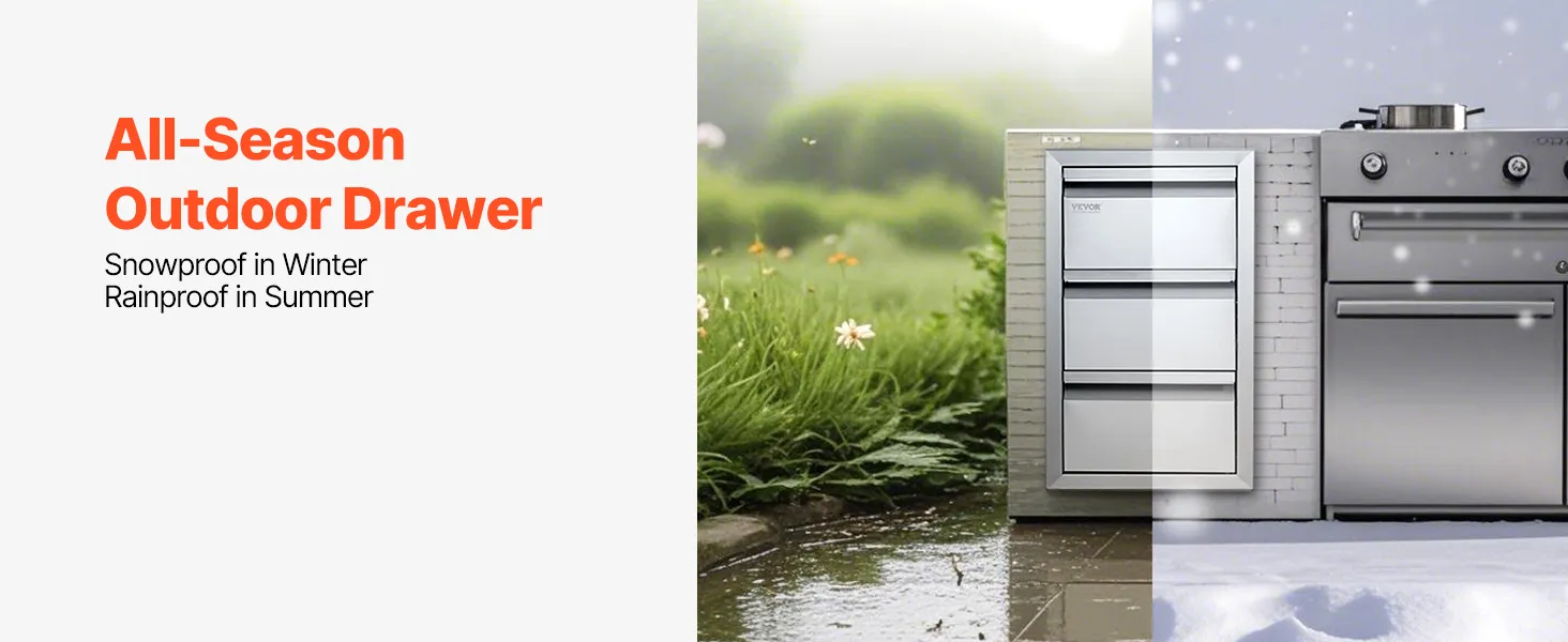 Q1: Is this drawer fully weatherproof? A1: Yes! Our outdoor kitchen drawer features a sealed design that protects against rain, snow, and humidity, keeping your grilling tools and essentials dry and secure all year round. Q2: What material is this drawer made of? A2: It's crafted from high-quality stainless steel, offering durability, rust resistance, and easy cleaning. Q3: Is this drawer easy to clean? A3: Absolutely! The smooth stainless steel surface resists stains and grease, making it effortless to wipe clean with a cloth. Q4: Can this be installed in a BBQ island or outdoor kitchen setup? A4: Yes! It's designed for built-in installation and fits perfectly in BBQ islands, outdoor kitchens, patios, and even restaurant kitchens.