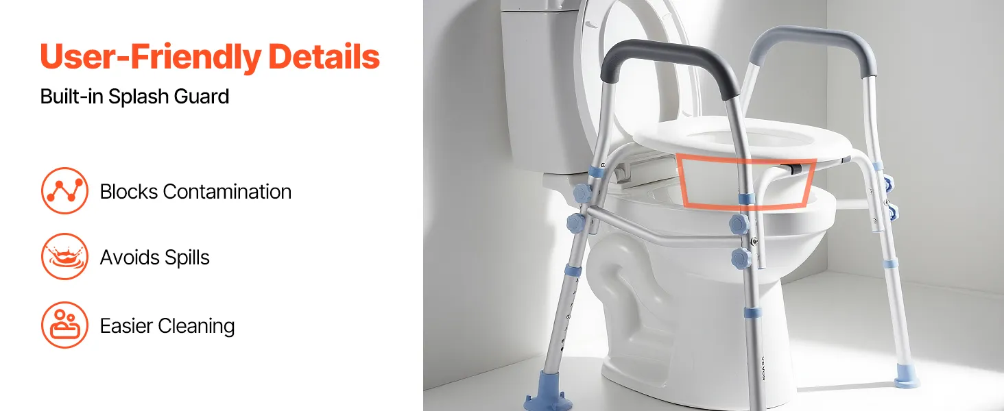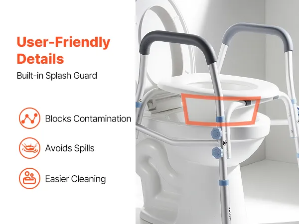 This elevated toilet seat includes a built-in splash guard to block water or waste from splashing onto the toilet exterior or clothing, helping reduce cleaning frequency and maintain a cleaner bathroom environment.