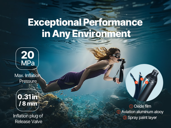 Изготовленный из авиационного алюминиевого сплава, этот баллон для подводного плавания устойчив к высокому давлению и коррозии, придавая вам уверенности во время каждого погружения в различных подводных условиях.