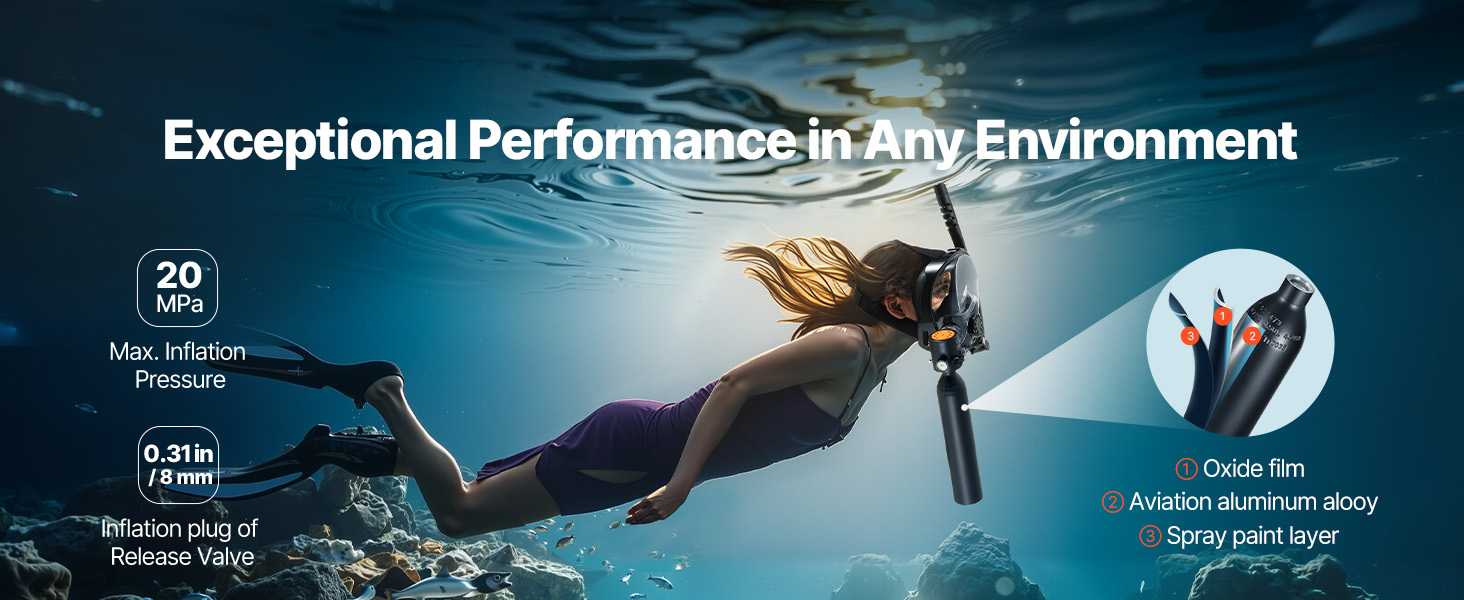 Изготовленный из авиационного алюминиевого сплава, этот баллон для подводного плавания устойчив к высокому давлению и коррозии, придавая вам уверенности во время каждого погружения в различных подводных условиях.