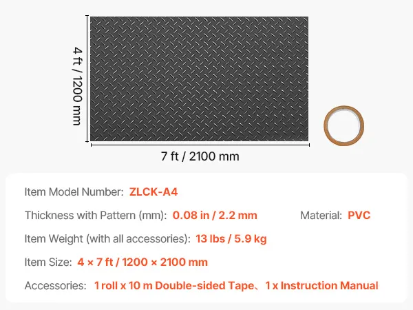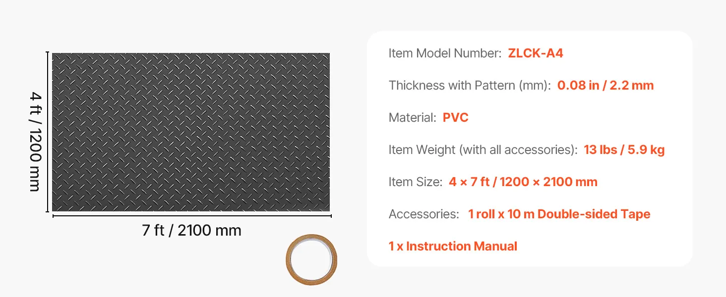 VEVOR Garage Floor Roll, 1.2 x 2.13 m Garage Flooring Mat, 2.2 mm Thickened PVC Diamond Plate Floor Protector Mat with Double-sided Tape, Non-Slip, Easy to Clean for Warehouse, Gyms, Trailer, Black