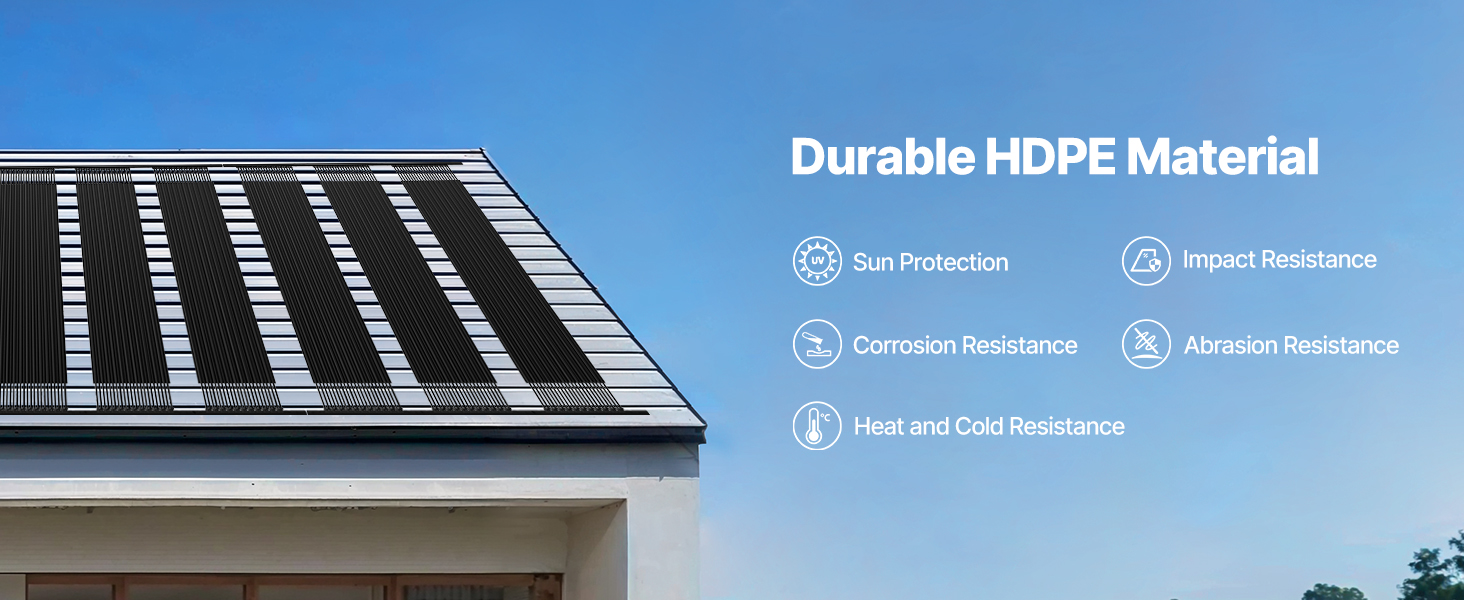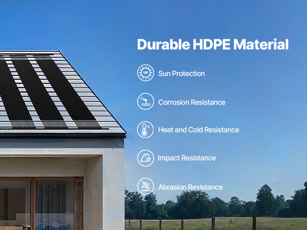 • Прочная конструкция: Изготовленные из коррозионностойкого материала HDPE, эти солнечные панели для бассейнов способны выдерживать суровые погодные условия, такие как сильный солнечный свет, высокие температуры, ветер и дождь, обеспечивая долгосрочную и стабильную работу.