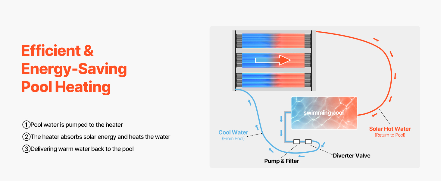 • Эффективное солнечное отопление: Благодаря внедрению эффективных систем солнечного обогрева бассейнов солнечная энергия быстро преобразуется в тепло, обеспечивая быстрое и эффективное повышение температуры воды в бассейне, продлевая купальный сезон при воздействии полного солнечного света.