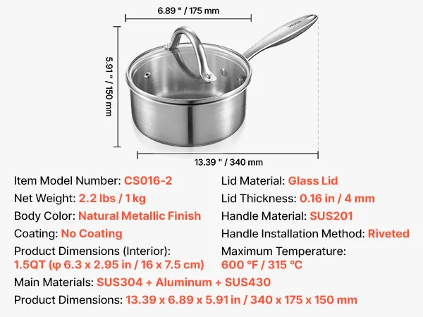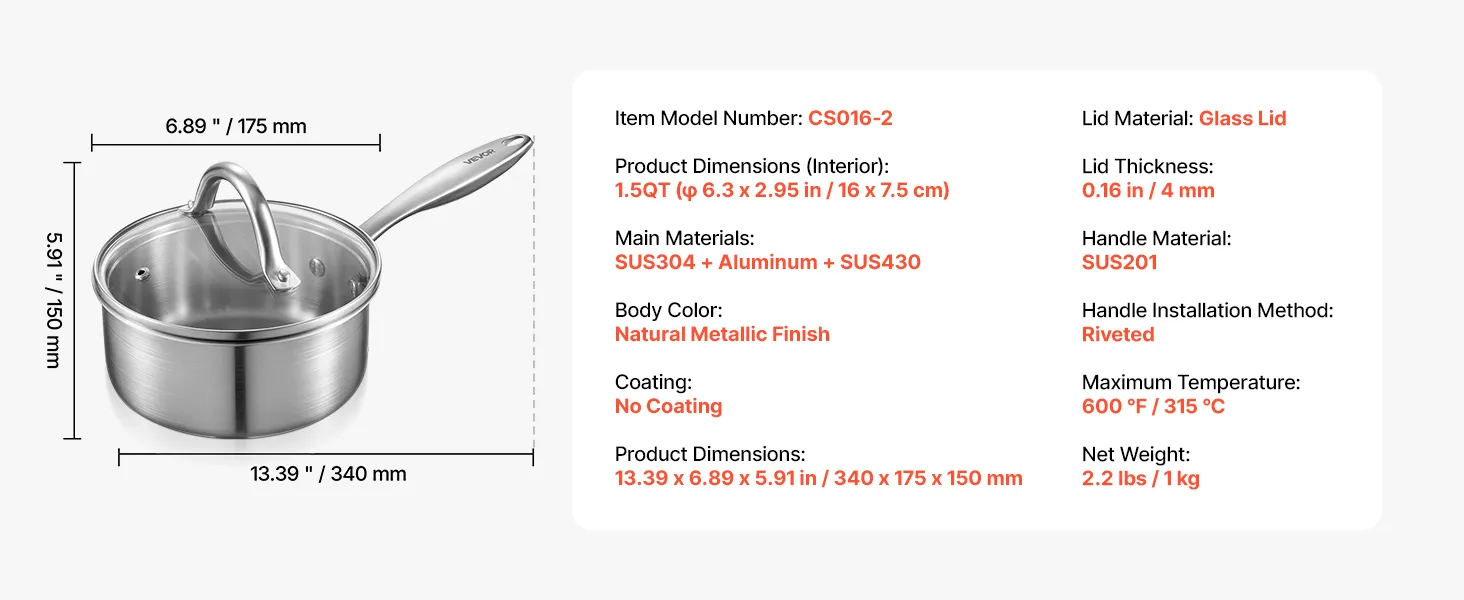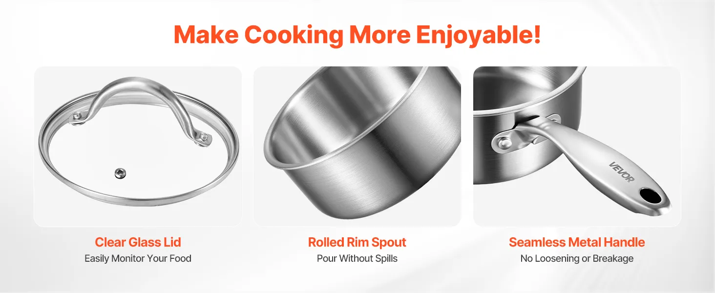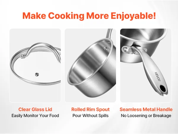 Our stainless sauce pan comes with a thickened transparent glass lid for monitoring cooking progress. The flared rim allows for drip-free pouring of soup and milk. The riveted one-piece metal handle ensures durability and avoids loosening or breakage during use.