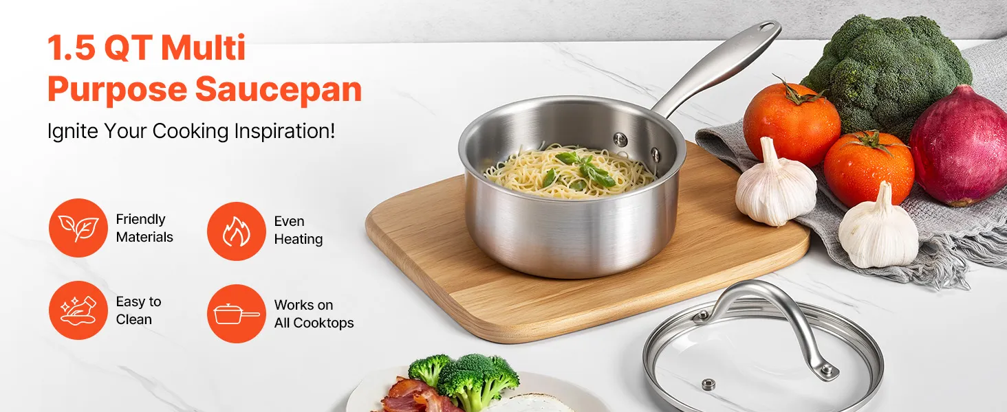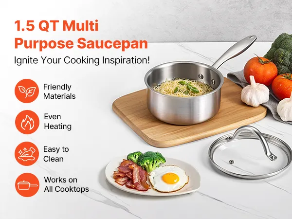 VEVOR 1.5 QT Saucepan, Stainless Steel Saucepan with Glass Lid, Multipurpose Nonstick Stainless Steel Small Cooking Sauce Pot with Ergonomic Handle, Friendly for Oven, Dishwasher, Induction Cooker
