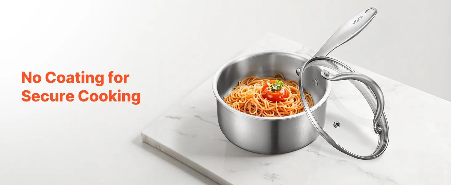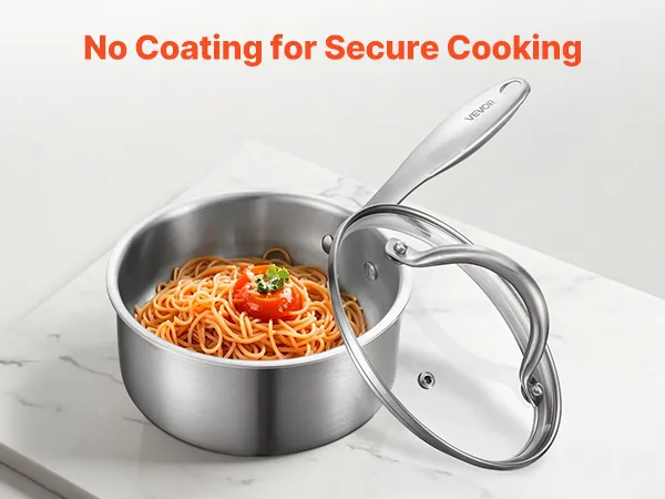 Made of high-quality 304 stainless steel with no coating. Secure, and reliable — no risk of peeling or flaking, making our saucepan with lid ideal for home chefs.