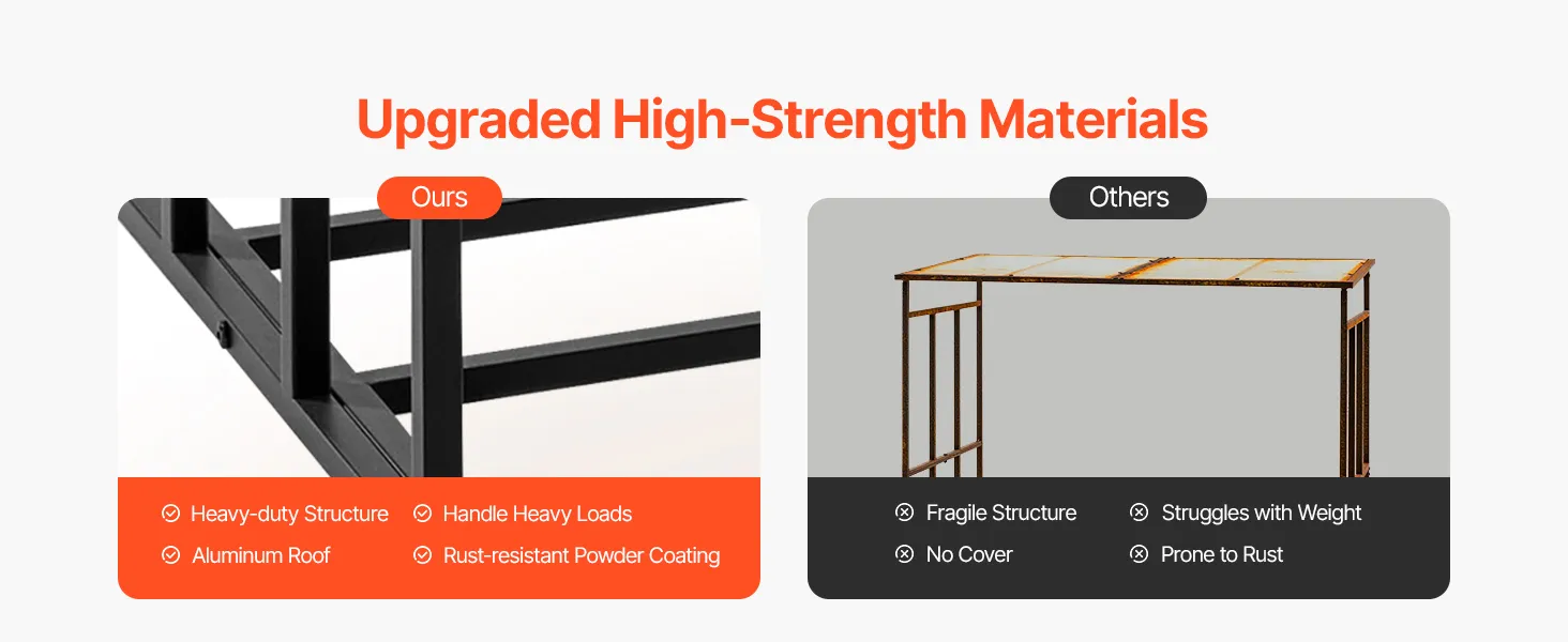 • Weatherproof Polycarbonate Roof: This outdoor wood rack comes with polycarbonate panels that are impact-resistant and UV-stabilized. The roof can withstand harsh weather, offering long-lasting protection for your firewood.