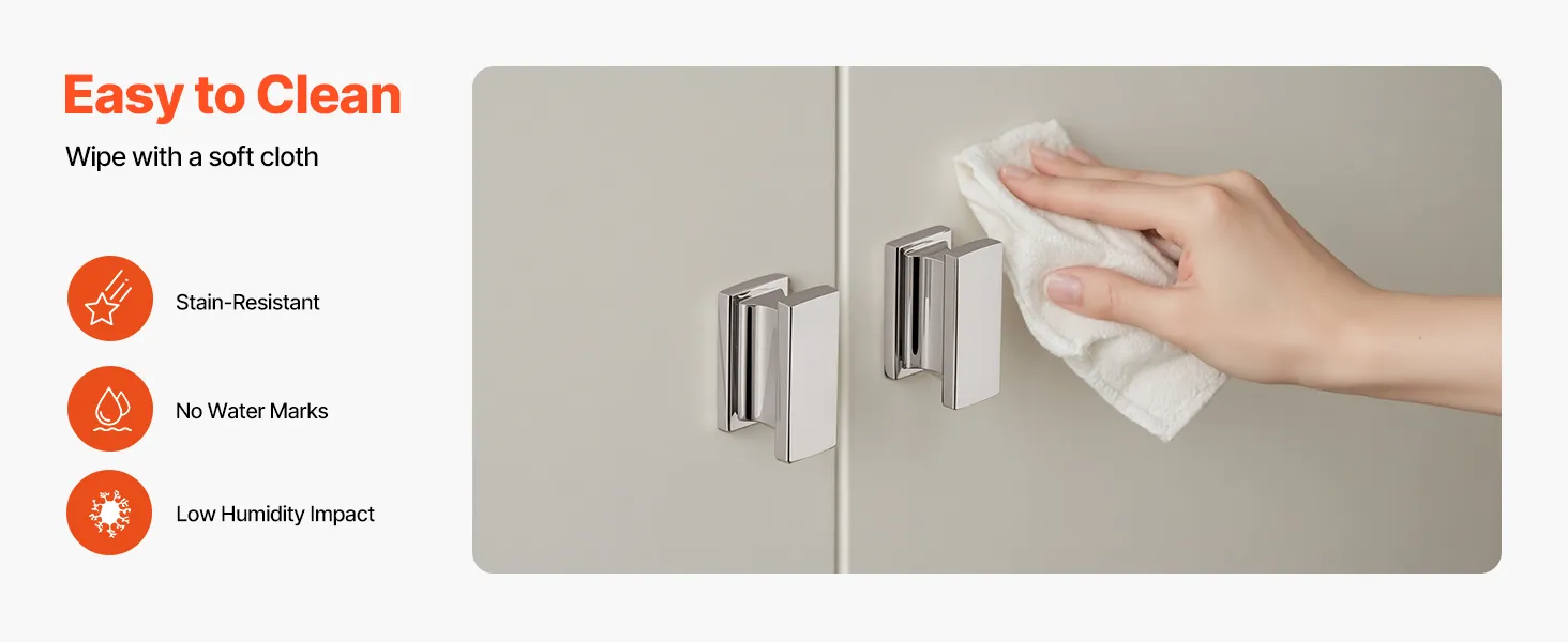 • Low Maintenance: For daily cleaning, simply wipe the drawer knob with a dry or damp soft cloth. The dense, smooth surface resists water stains and grease, restoring its clean, glossy look in seconds and staying neat for the long term