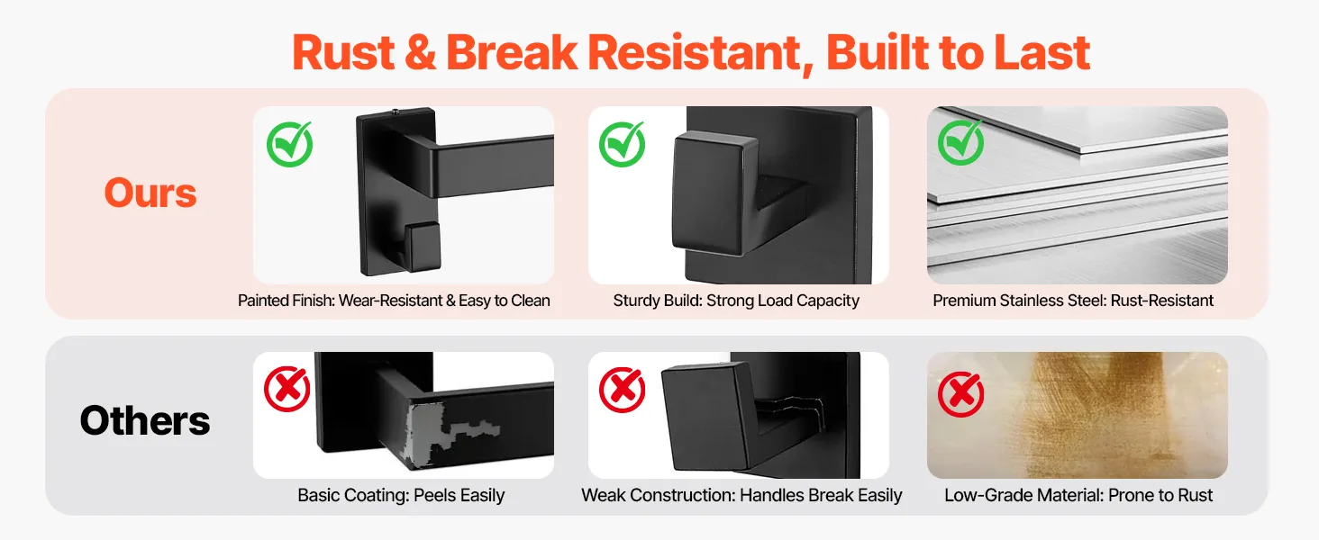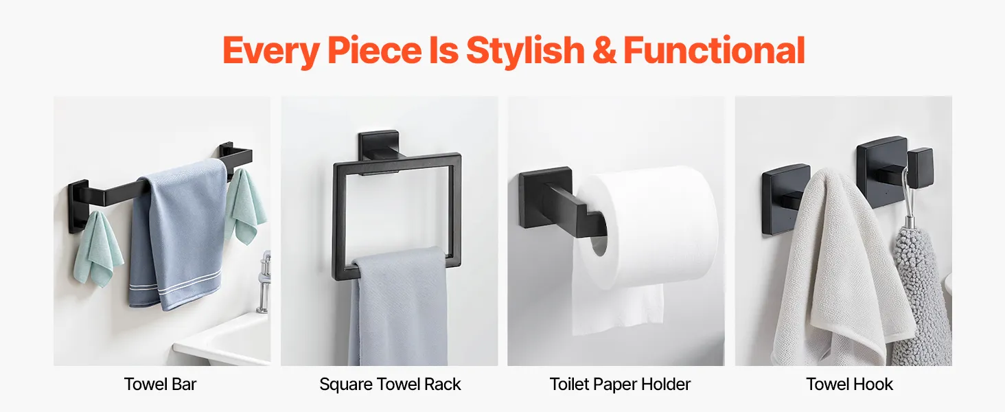 • Sleek Design: Featuring a minimalist square shape and premium matte black finish, this bathroom hardware resists stains and scratches for long-lasting beauty. The beveled edges keep you from accidental scrapes, while its timeless style complements a wide range of bathroom décors with elegance