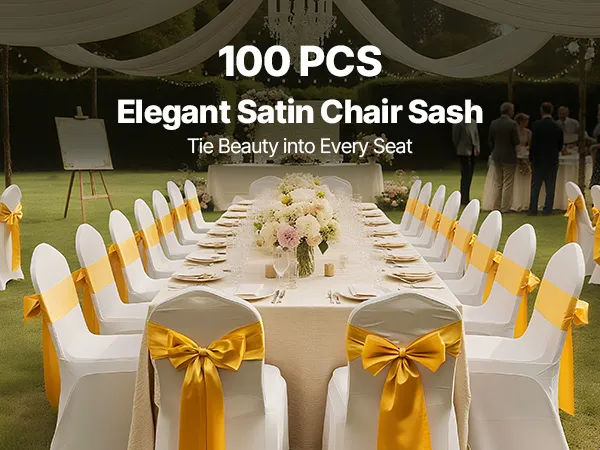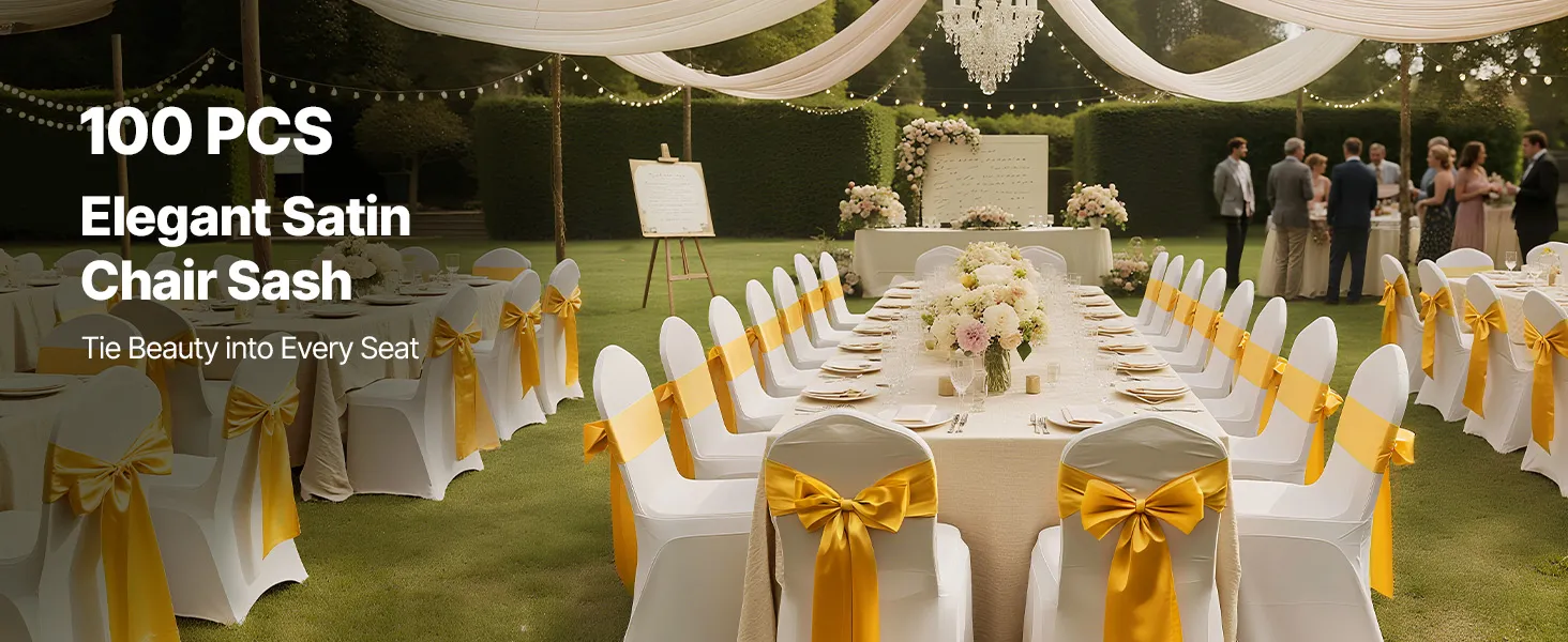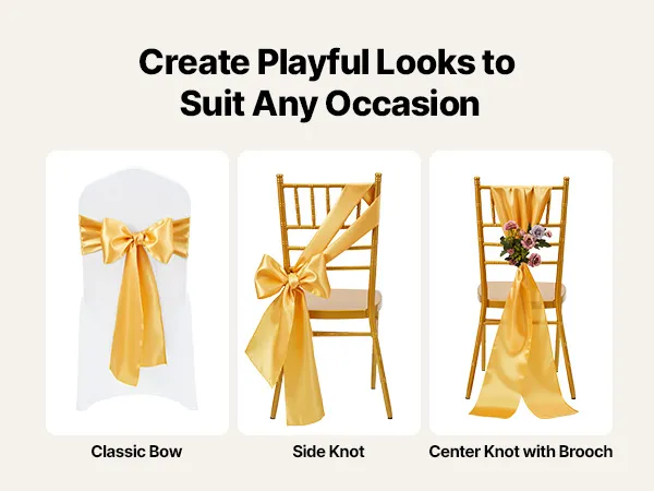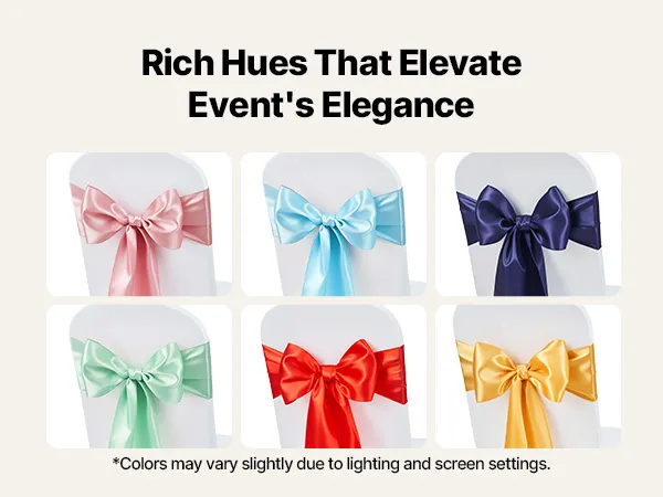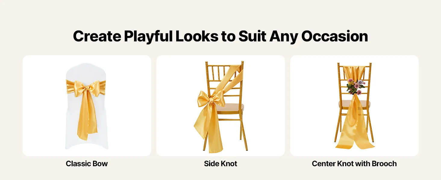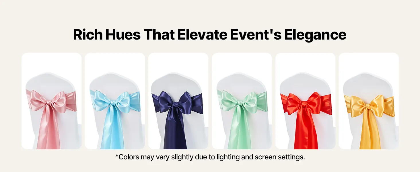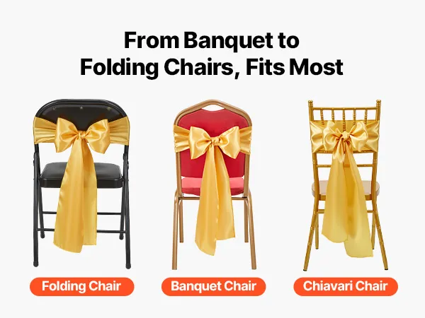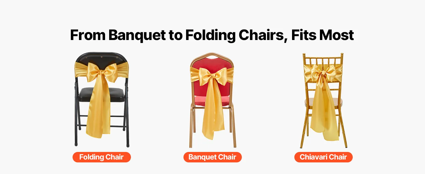A2: The sashes measure approximately 275cm x 17cm (108" x 6.7") and are designed to fit a wide range of chairs—including banquet chairs, folding chairs, Chiavari chairs, and dining chairs, suitable for chairs of most sizes.