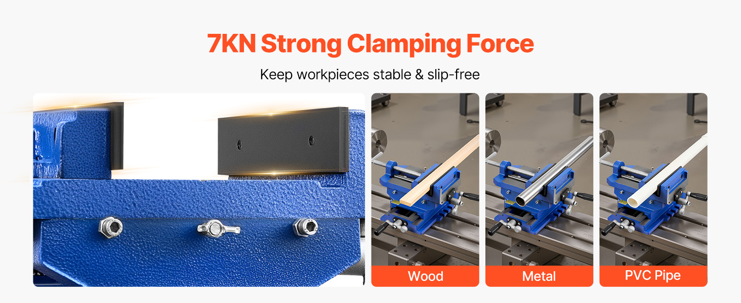 Delivers up to 7 KN of powerful clamping force, the drill press vise ensures secure fixation of wood, metal, and PVC pipes.
