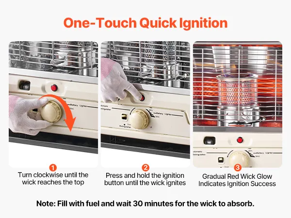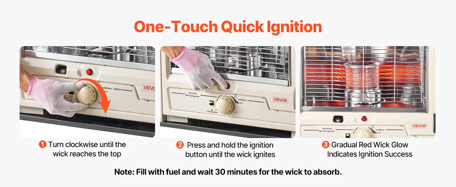 Before first use, fill the tank and wait 10 minutes for the wick to absorb fuel fully. This ensures better ignition and performance for your portable kerosene heater.